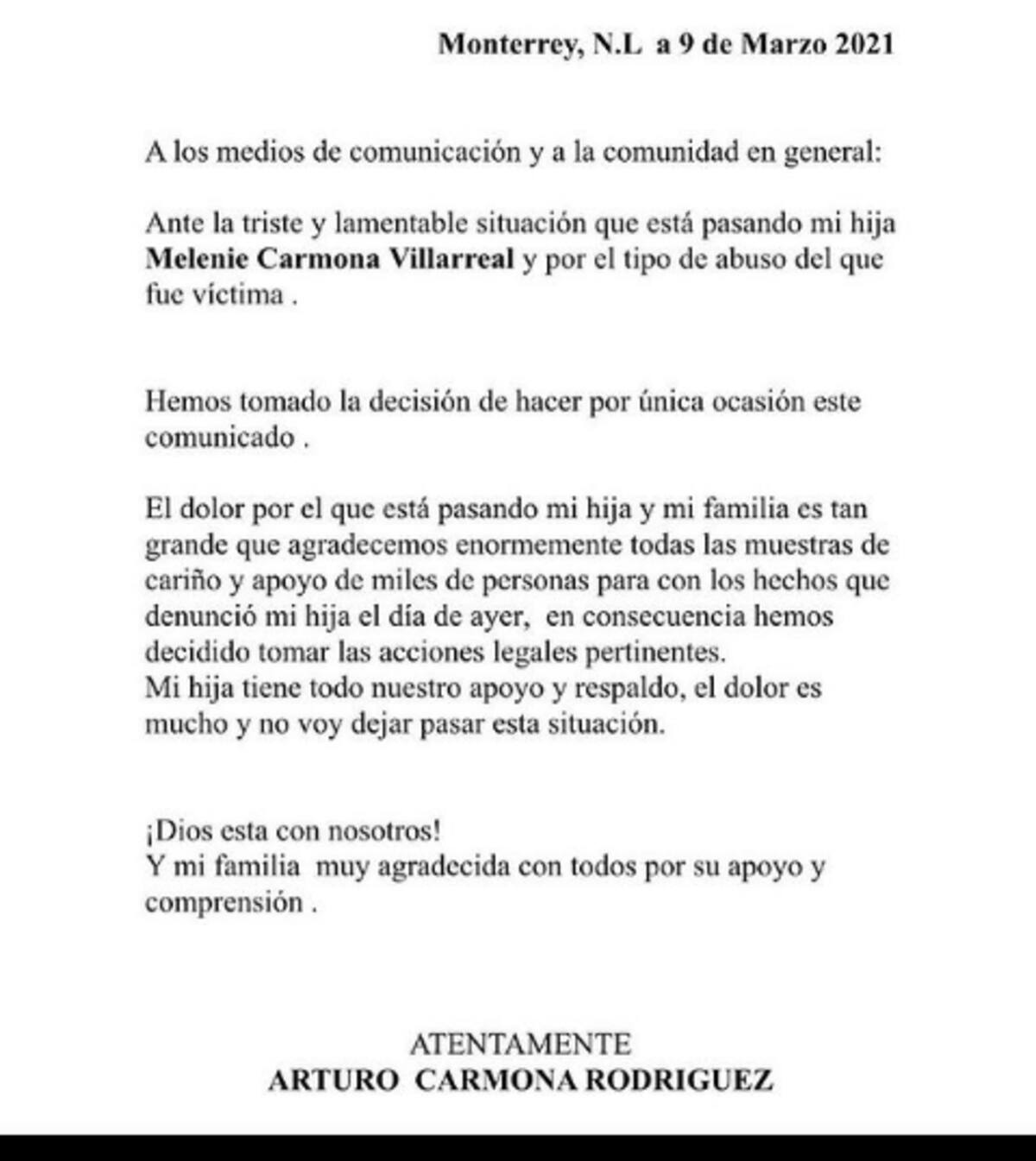 “Ante la triste y lamentable situación que está pasando mi hija Melanie Carmona Villarreal y por el tipo de abuso del que fue víctima. Hemos tomado la decisión de hacer por única ocasión este comunicado”, se lee en el mensaje de Arturo Carmona.