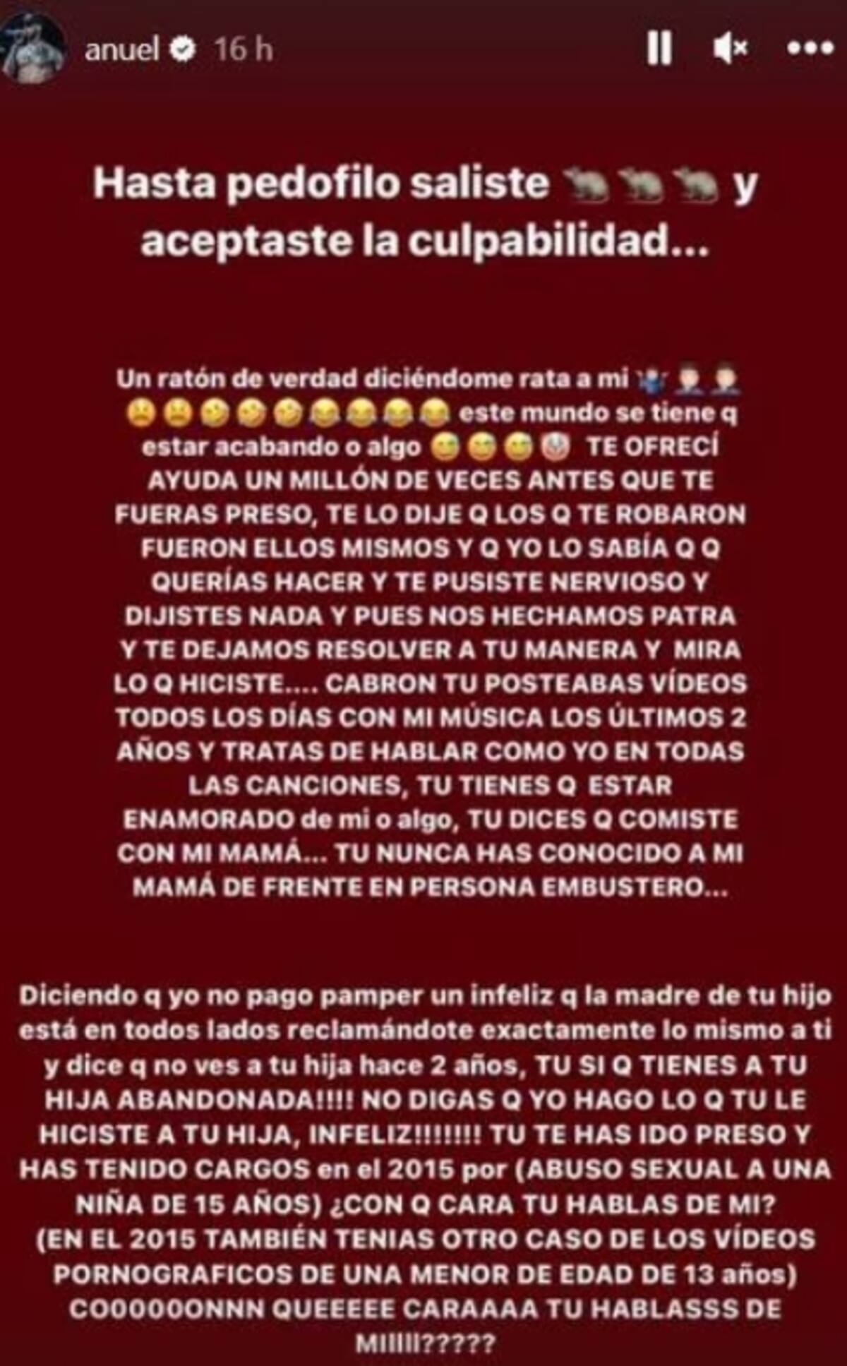 La disputa comenzó cuando Anuel compartió una foto de su hija Cattleya, fruto de su relación con Yailin. Esto provocó la crítica de Tekashi, quien afirmó que Anuel no frecuenta a su hija ni le proporciona el sustento necesario. Estas declaraciones enfurecieron al reguetonero, quien respondió a través de una extensa publicación en sus historias de Instagram. En ella mencionó los problemas legales de Tekashi, lo acusó de pedofilia y afirmó que tampoco cumple con sus responsabilidades como padre, ya que no ha visto a su hija en dos años.