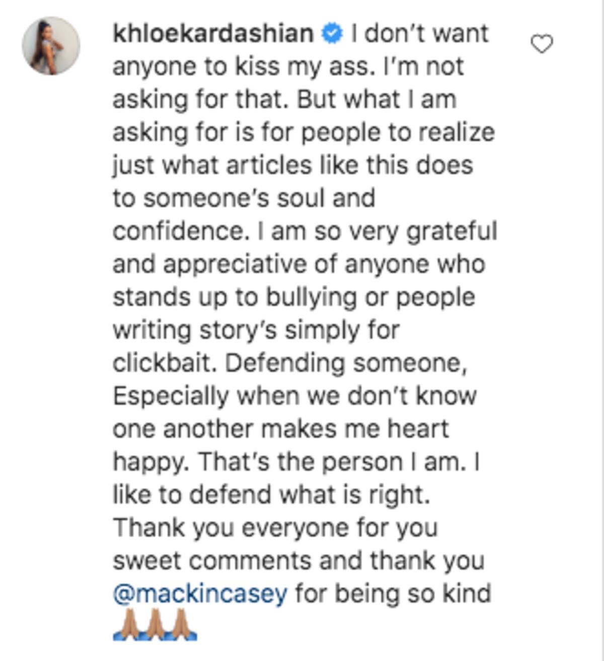 “No quiero que nadie me bese el trasero. No estoy pidiendo eso. Pero lo que estoy pidiendo es que la gente se dé cuenta de lo que hacen los artículos como este en el alma y la confianza de alguien. Estoy muy agradecida y aprecio a cualquiera que se enfrente a la intimidación o a las personas que escriben historias simplemente por hacer clickbait.”, escribió Kardashian.
