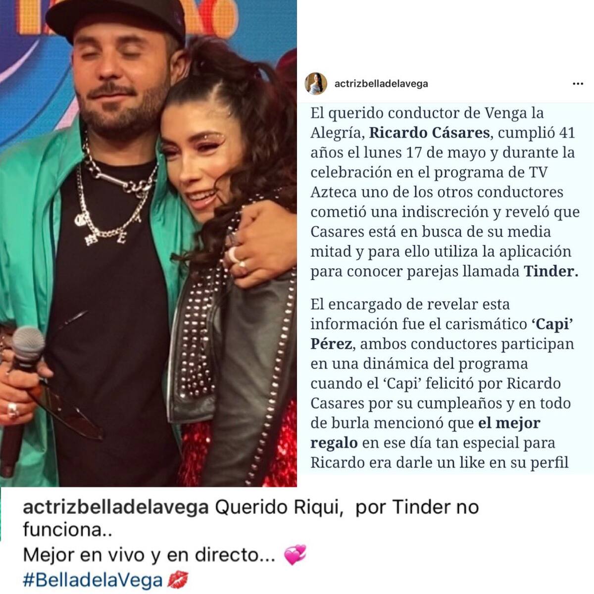 Fue por este motivo que Bella de la Vega retomó la conversación y envió una coqueta dedicatoria al hombre, de 41 años: “Querido Riqui, por Tinder no funciona. Mejor en vivo y en directo”.
