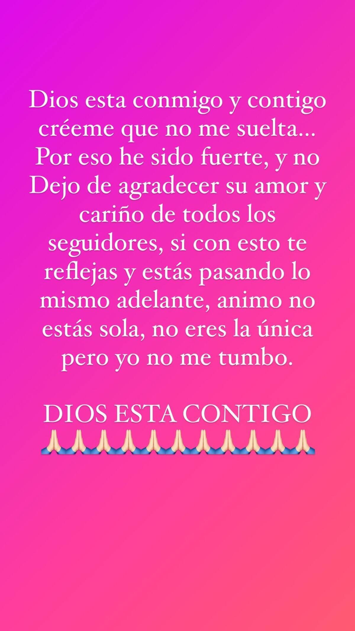 “Dios está conmigo y contigo, créeme que no me suelta… por eso he sido fuerte, y no dejo de agradecer su amor, y cariño de todos los seguidores, si con este te reflejas, y estás pasando lo mismo adelante, ánimo, no estás sola, no eres la única, pero yo no me tumbo. Dios está conmigo”, concluyó.