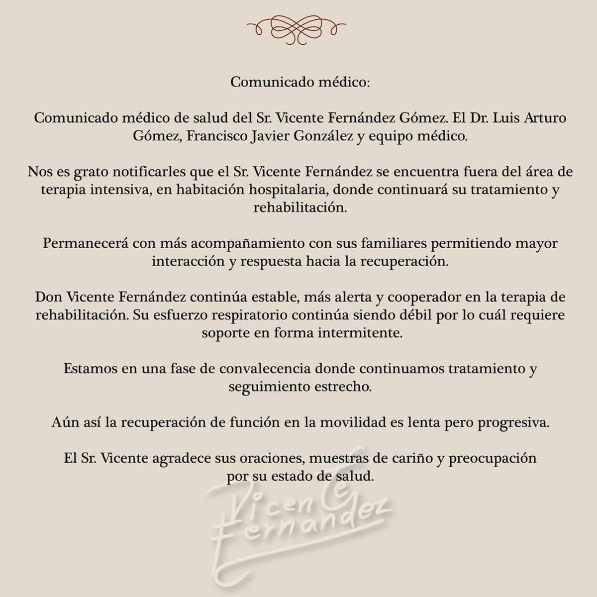 Por último, la familia Fernández Abarca agradeció a los fanáticos del cantante por estar al pendiente de su salud y las muestras de cariño.