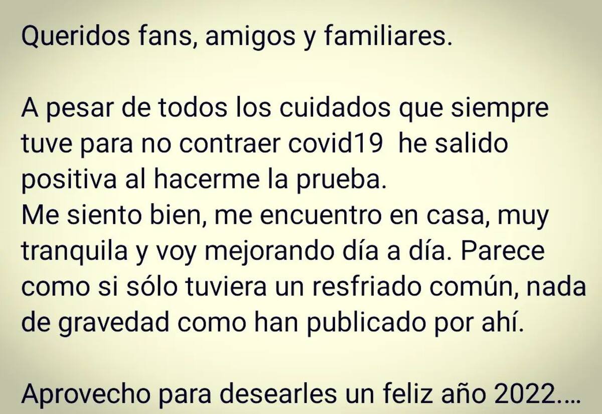 Queridos fans, amigos y familiares. A pesar de todos los cuidados que siempre tuve para no contraer COVID-19, he salido positiva al hacerme la prueba”, comienza el mensaje de “La Chilindrina”.