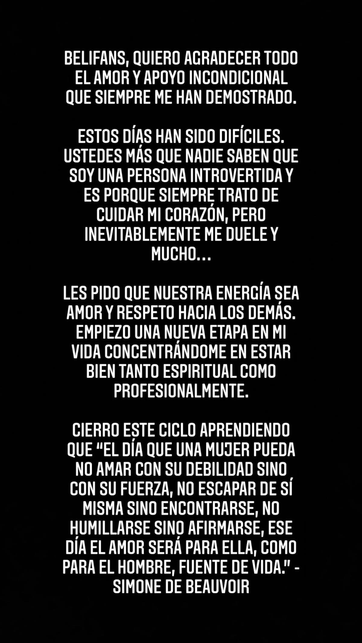 Belifans, quiero agradecer todo el amor y apoyo incondicional que siempre me han demostrado. Estos días han sido difíciles. Ustedes más que nadie saben que soy una persona introvertida y es porque siempre trato de cuidar mi corazón, pero inevitablemente me duele y mucho", comenzó su mensaje Belinda.