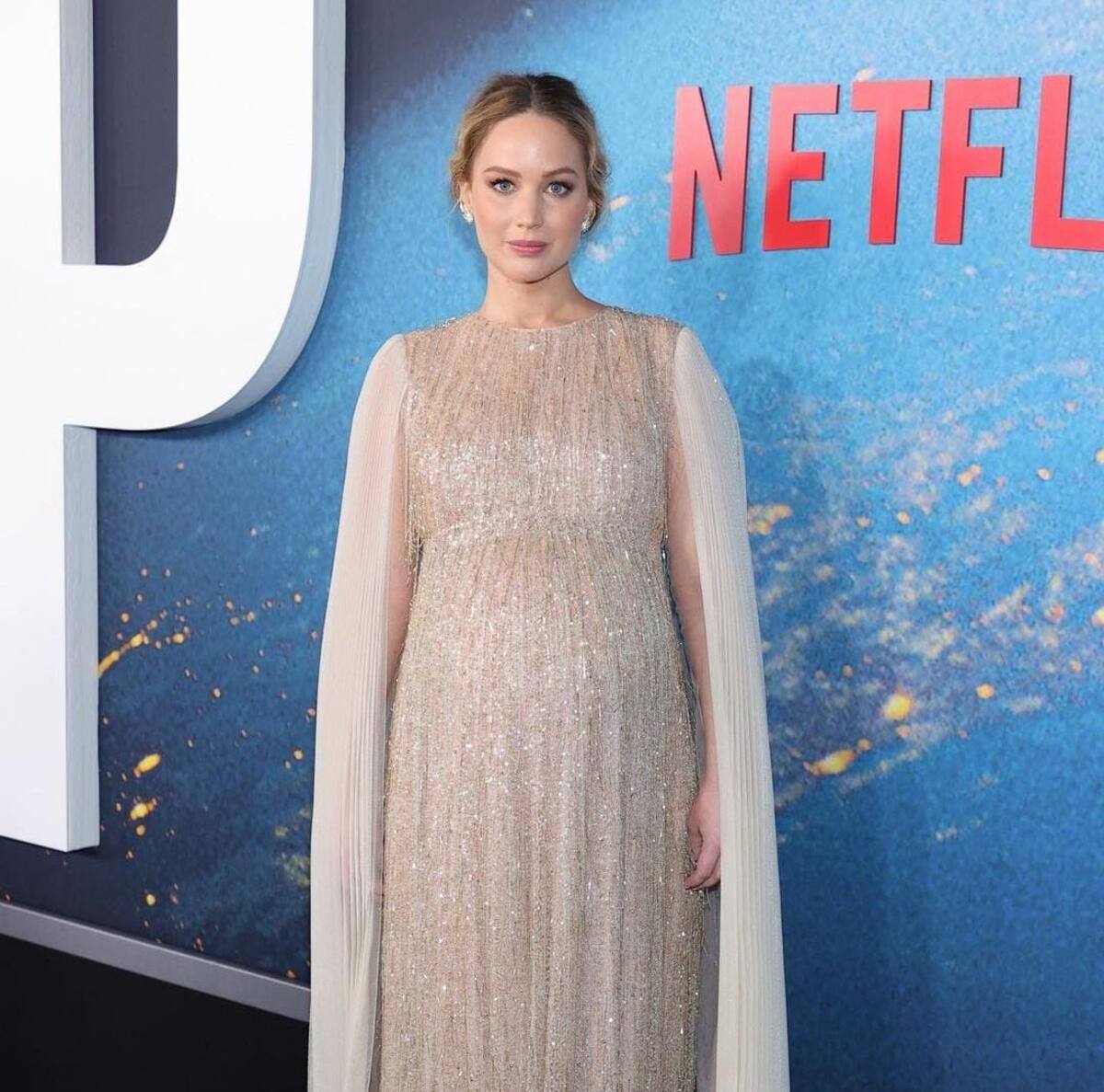 Durante la alfombra roja de la película “Don't Look Up” el pasado mes de diciembre, la protagonista de “The Hunger Games” mostró su avanzado embarazo en un espectacular vestido dorado de la maca Dior.