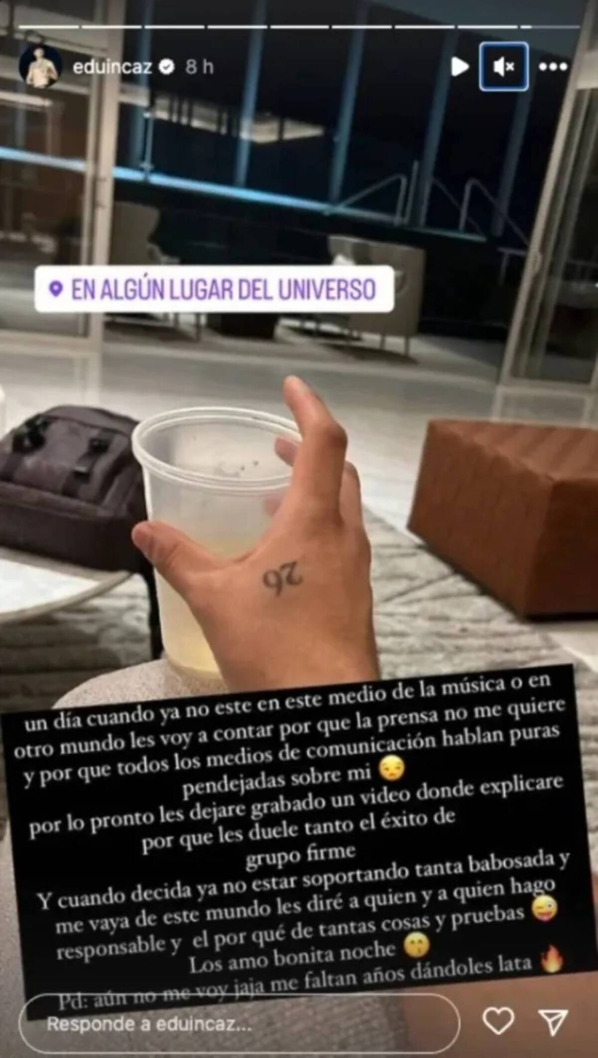 “Un día, cuando ya no esté en este medio de la música o en otro mundo, les voy a contar por qué la prensa no me quiere y por qué todos los medios de comunicación hablan puras pendej*das sobre mí… Por lo pronto, les dejaré grabado un video donde explicaré por qué les duele tanto el éxito de Grupo Firme”, se lee al inicio del mensaje que compartió el líder de Grupo Firme.