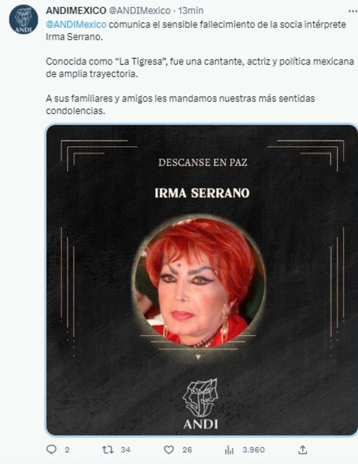 @ANDIMÉXICO comunica el sensible fallecimiento de la socia intérprete Irma Serrano. Conocida como "La Tigresa", fue una cantante, actriz y política mexicana de amplia trayectoria. A sus familiares y amigos les mandamos nuestras más sentidas condolencias", tuitearon.