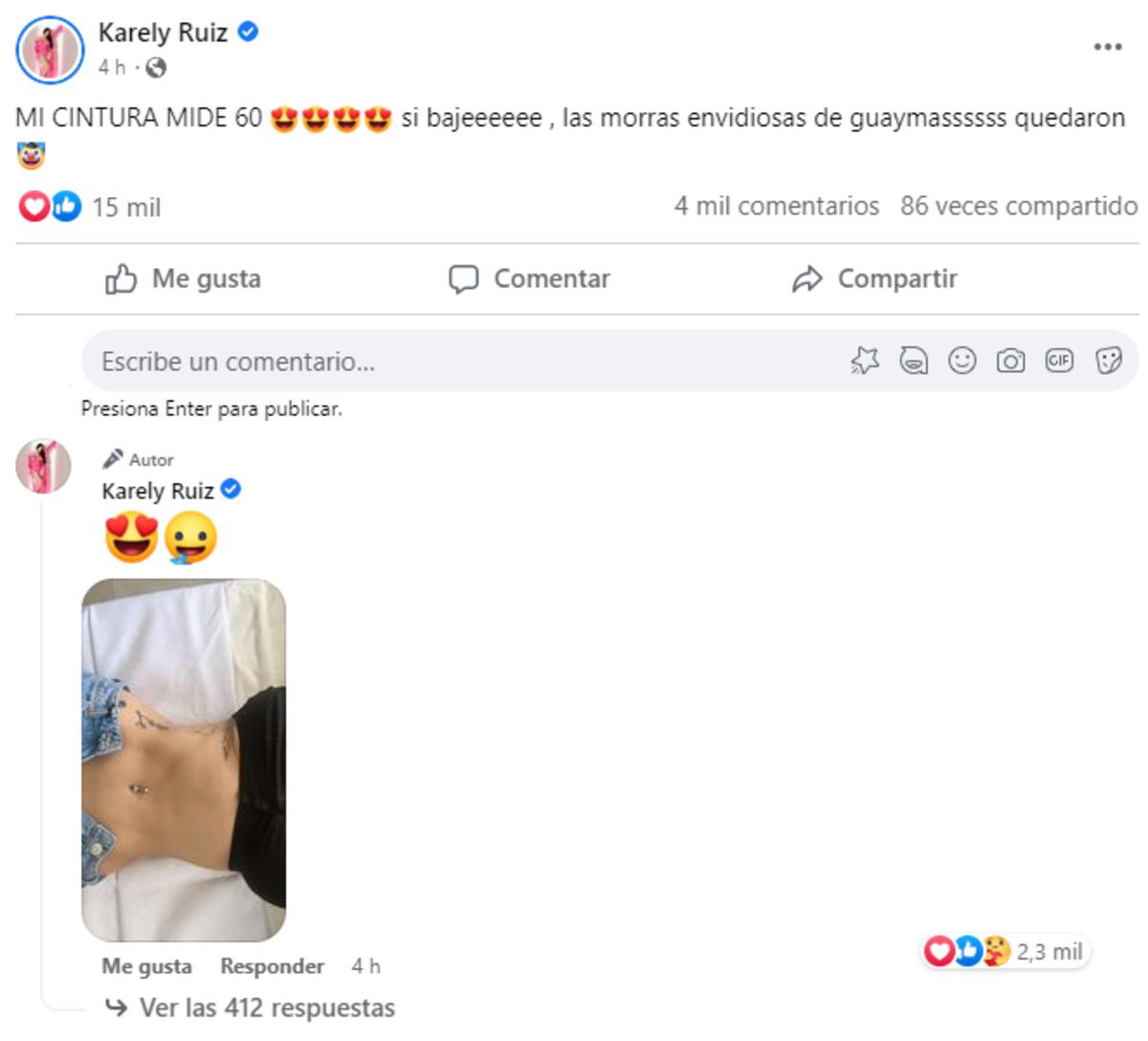 Ahora, Karely Ruiz compartió mediante su cuenta de Facebook que nuevamente su cintura mide 60 centímetros, por lo que tachó de envidiosas a las mujeres de Guaymas que la criticaron.