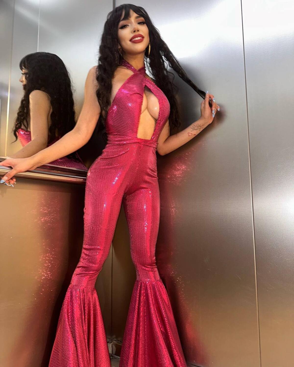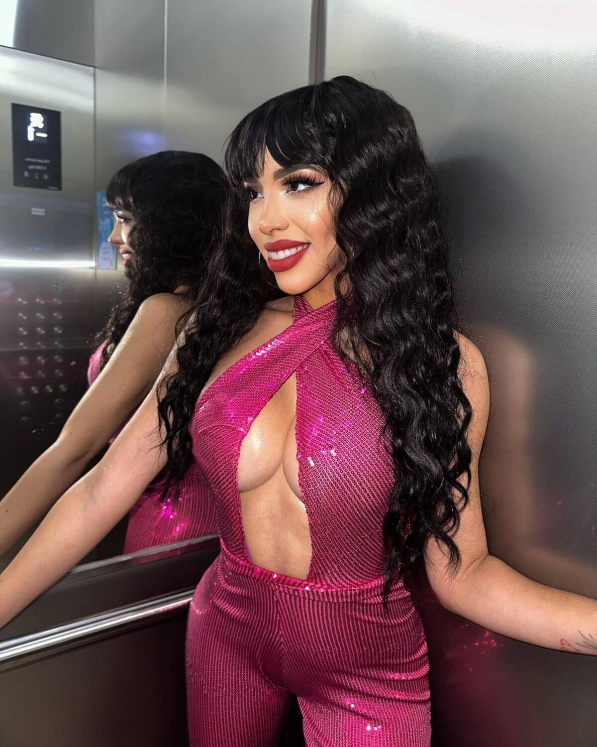 En las imágenes se miraba a Yeri Mua luciendo su tuneada figura con un jumpsuit morado, atuendo que combinó con arracadas grandes, y una peluca peinada con copete y ondas. La famosa hizo estas fotos dentro de un elevador.