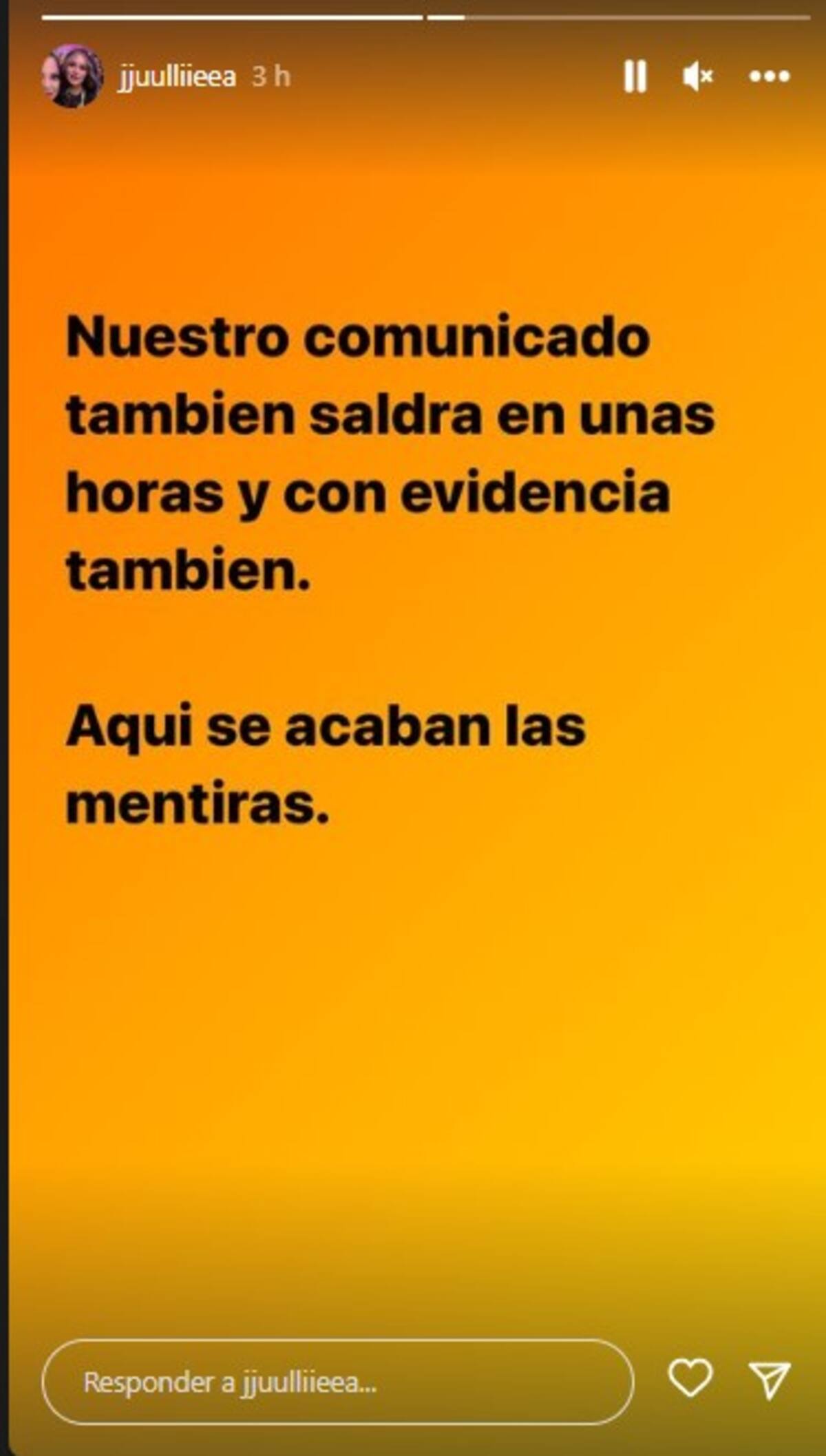 “Nuestro comunicado también saldrá en unas horas y con evidencias. Aquí se acaban las mentiras”, escribió en una historia de Instagram.