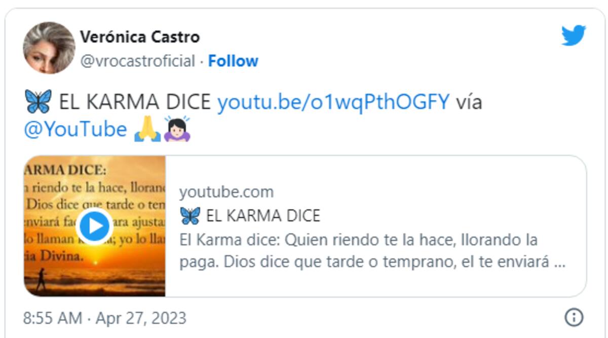 “El Karma dice: Quien riendo la hace, llorando la paga”, se lee en una publicación de Twitter de la actriz.