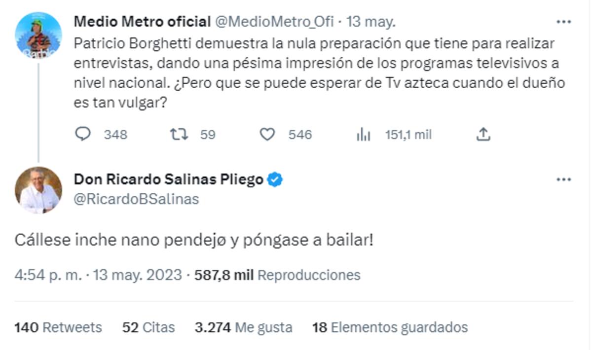 Ciudad de México.- Una nueva batalla protagonizó Ricardo Salinas Pliego, en esta ocasión contra “Medio Metro el original”, luego de que el bailarín soltara un comentario en Twitter criticando a uno de los conductores de TV Azteca y al mismo dueño de la televisora.