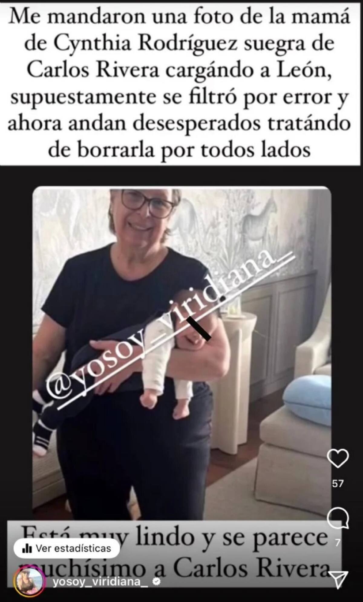 “Me mandaron una foto de la mamá de Cynthia Rodríguez, suegra de Carlos Rivera, cargando a León. Supuestamente se filtró por error y ahora andan desesperados tratando de borrarla por todos lados. Está muy lindo y se parece muchísimo a Carlos Rivera”, se expresó en la publicación.