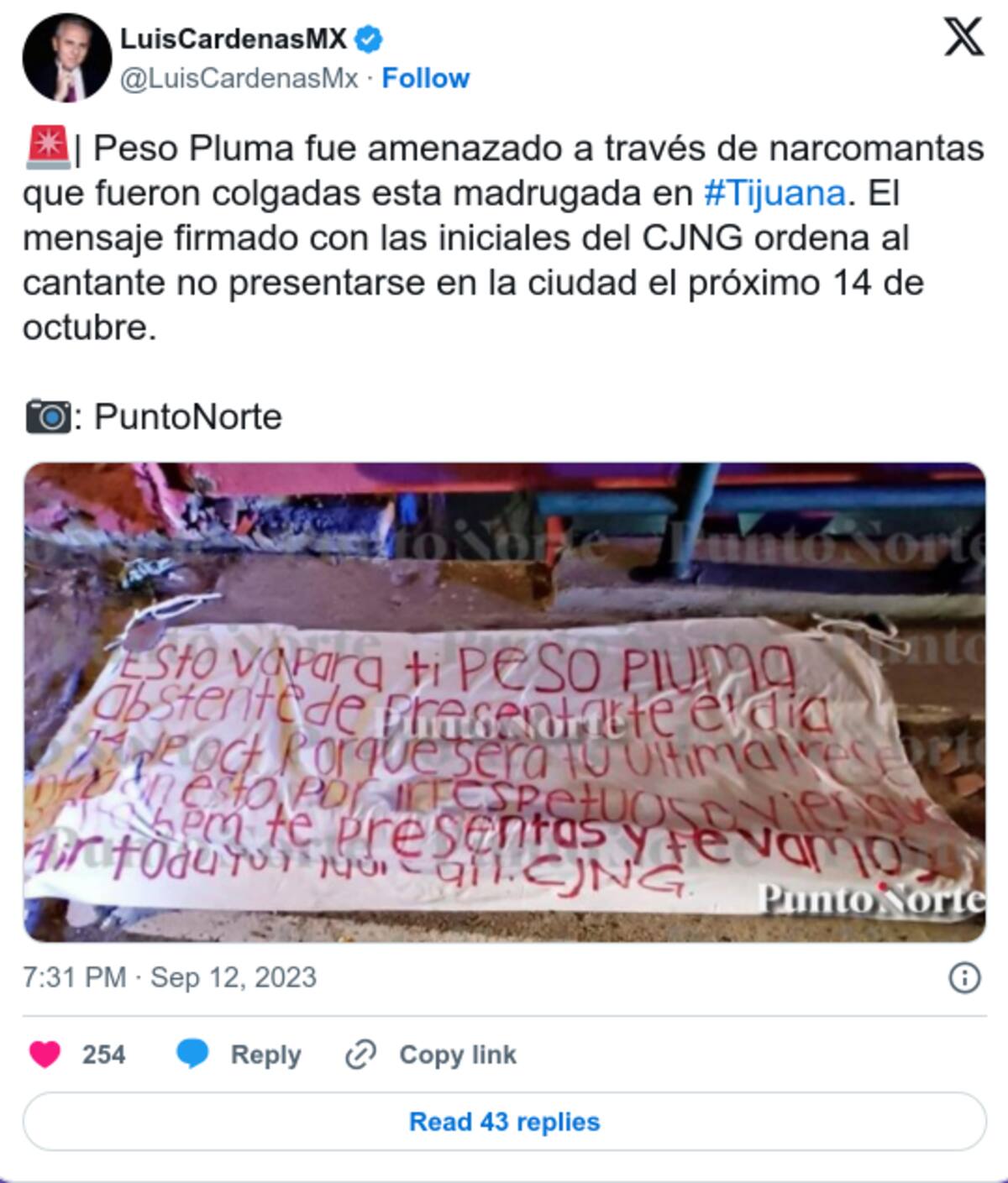 El pasado mes de septiembre, aparecieron unas "narcomantas" cerca del fraccionamiento El Mirador en Tijuana, destinadas a Peso Pluma, cuyo nombre real es Hassan Emilio Kabande Laija, en donde el Cártel de Jalisco Nueva Generación (CJNG) le prohibió presentarse en un concierto que tenía fechado para el 14 de octubre, en donde le amenazaron de muerte si lo hacía.