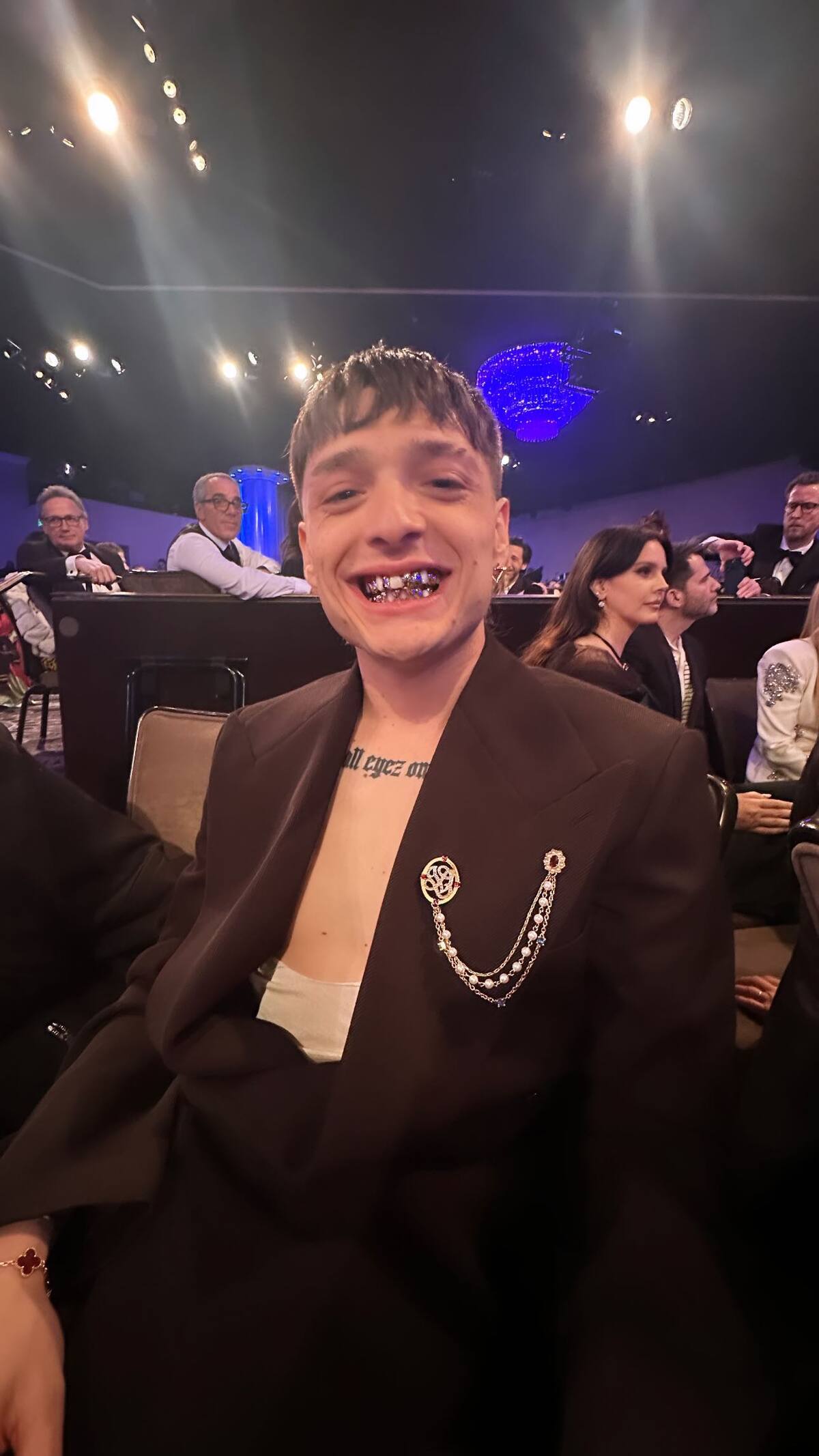 En las fotografías compartidas en la gala previa a los Grammy, Peso Pluma se dejó ver con una dentadura que, a primera vista, podría parecer una pérdida de dientes. Sin embargo, una observación más detenida revela que se trata de la última tendencia en joyería dental: los grillz.