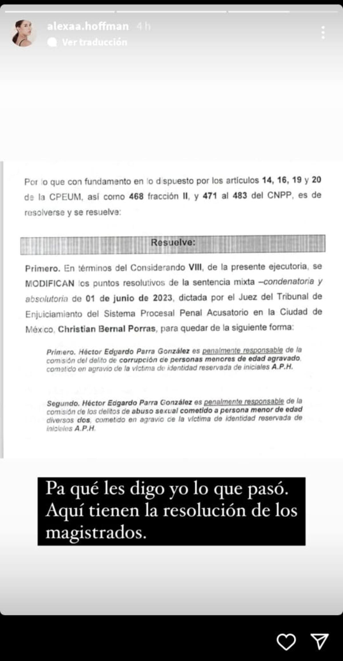 Por otro lado, también compartió la resolución oficial de los magistrados, haciendo a Héctor Parra “penalmente responsable de la comisión de los delitos de corrupción de personas menores de edad agravado”, así como de “abuso sexual cometido a persona menor de edad”.