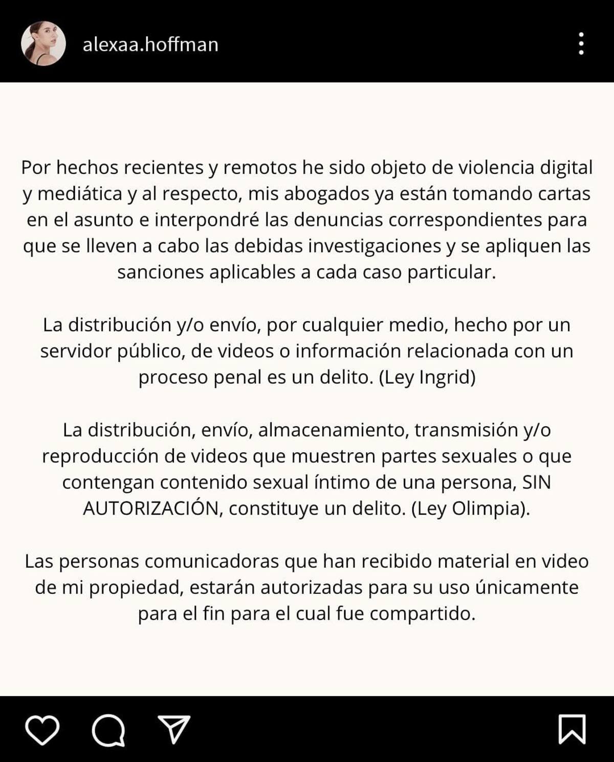 En un comunicado compartido a través de su cuenta de Instagram, Alexa Hoffman ha anunciado que tomará medidas legales contra quienes hayan difundido de manera indebida videos relacionados con el proceso penal en el que su padre está involucrado. La joven ha manifestado ser objeto de violencia digital y mediática, y ha declarado que sus abogados están interviniendo para presentar las denuncias correspondientes.