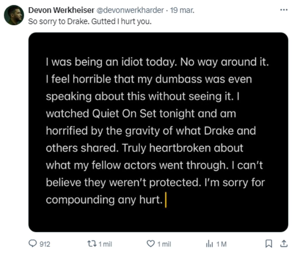 Horas más tarde, Werkheiser emitió una disculpa pública en la que reconoció su comportamiento inapropiado y expresó sentirse "horrible" por sus palabras. Además, Nickelodeon emitió un comunicado expresando su compromiso de investigar todas las quejas formales como parte de su esfuerzo por garantizar un ambiente de trabajo seguro y profesional.