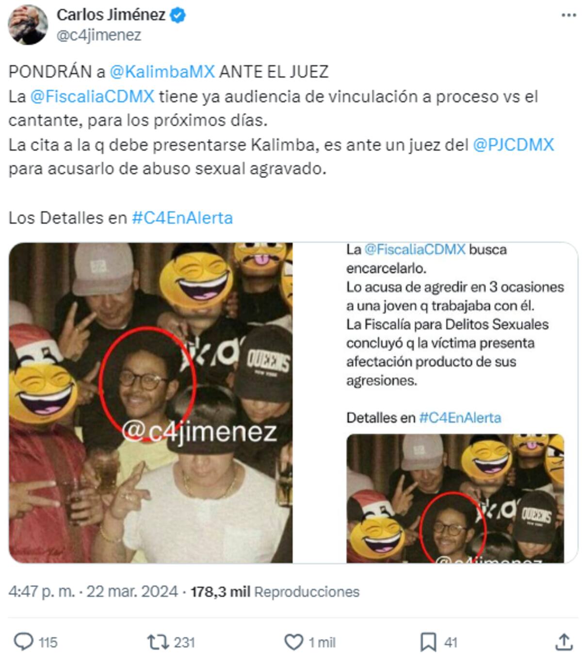 El pasado viernes 22 de marzo, el periodista Carlos Jiménez, a través de su cuenta de X, dio a conocer sobre una orden aprehensión contra Kalimba, quien, según el periodista fue acusado nuevamente de abuso sexual por una supuesta compañera de trabajo.