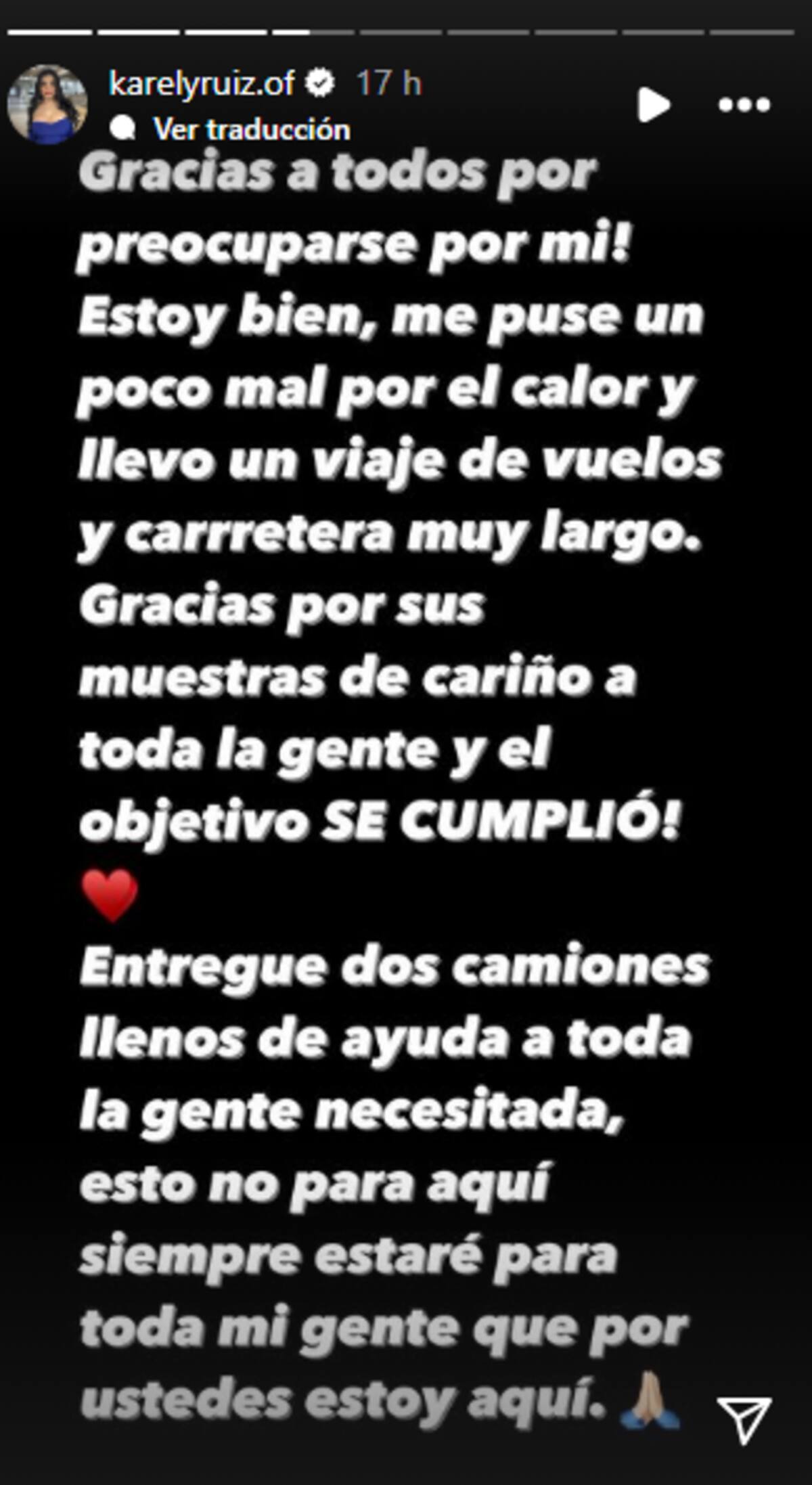 Tras la primera entrega, se informó que Karely Ruiz tuvo que ser auxiliada por una ambulancia debido a que se sintió mal por el largo viaje y el cambio de temperatura. Sin embargo, la influencer salió a desmentir este hecho y aseguró que simplemente se sintió afectada por el calor y dio a conocer que no fue nada grave y que se siente mucho mejor y feliz de haber podido ayudar.