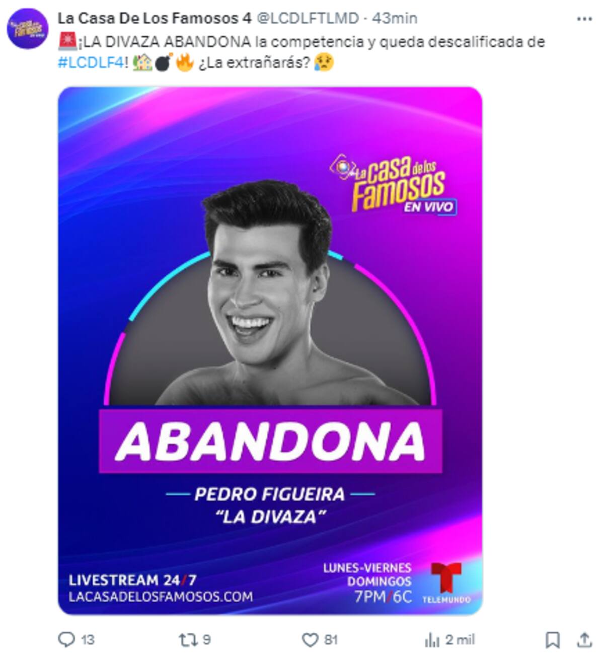 El influencer Pedro Luis Joao Figueira Álvarez, reconocido como “La Divaza”, protagonizó un giro inesperado en el reality show “La Casa de los Famosos” de Telemundo. Durante la última gala del programa, se anunció su salida voluntaria de la competencia, lo que impactó tanto a los habitantes de la casa como a sus seguidores.