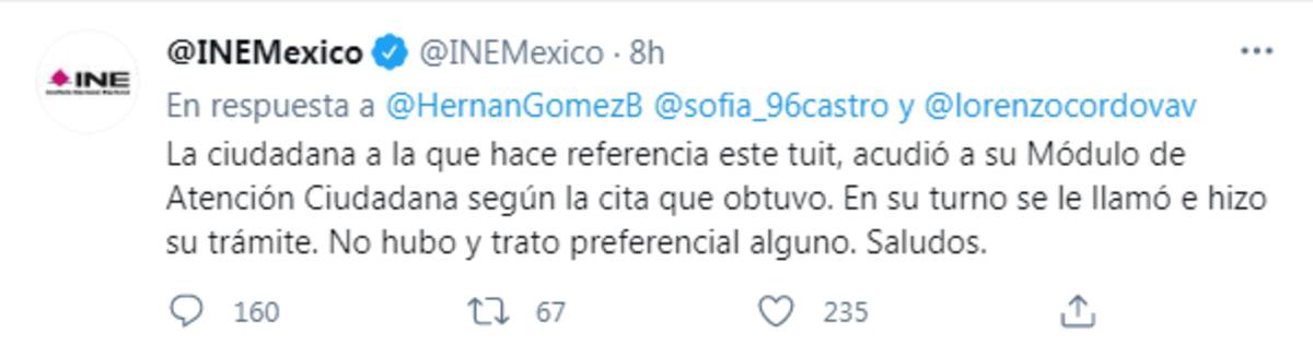 Por su parte, por medio de su cuenta oficial de Twitter, el INE aclaró que Sofía había acudido al módulo con cita y que por ello no había realizado la fila.