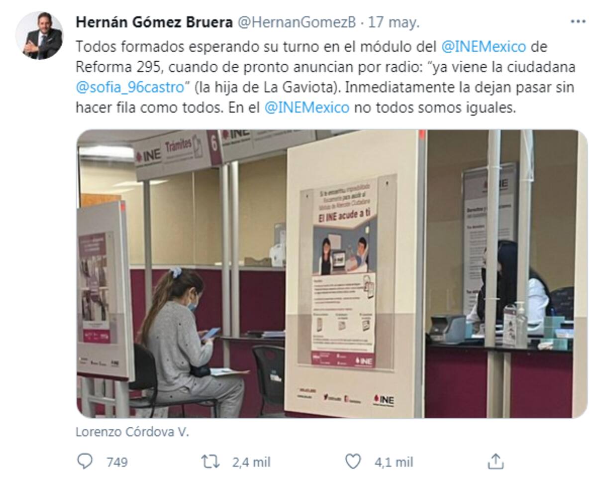 Según el periodista Hernán Gómez Bruera, Castro de 24 años, acudió al módulo del Instituto Nacional Electoral (INE) ubicado en Reforma 295, y presuntamente no tuvo que hacer fila como el resto de las personas que intentaban hacer ese trámite.