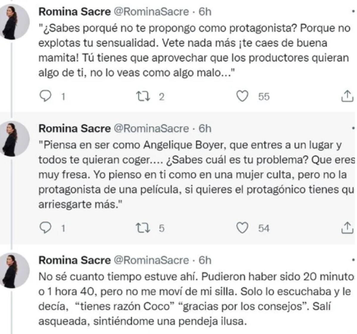 Romina Sacre comentó que al igual que otras presuntas víctimas, también fue citada en la oficina del productor, quien tras cerrar la puerta le habría externado un discurso sobre la necesidad de “explotar su sensualidad” para conseguir trabajo.