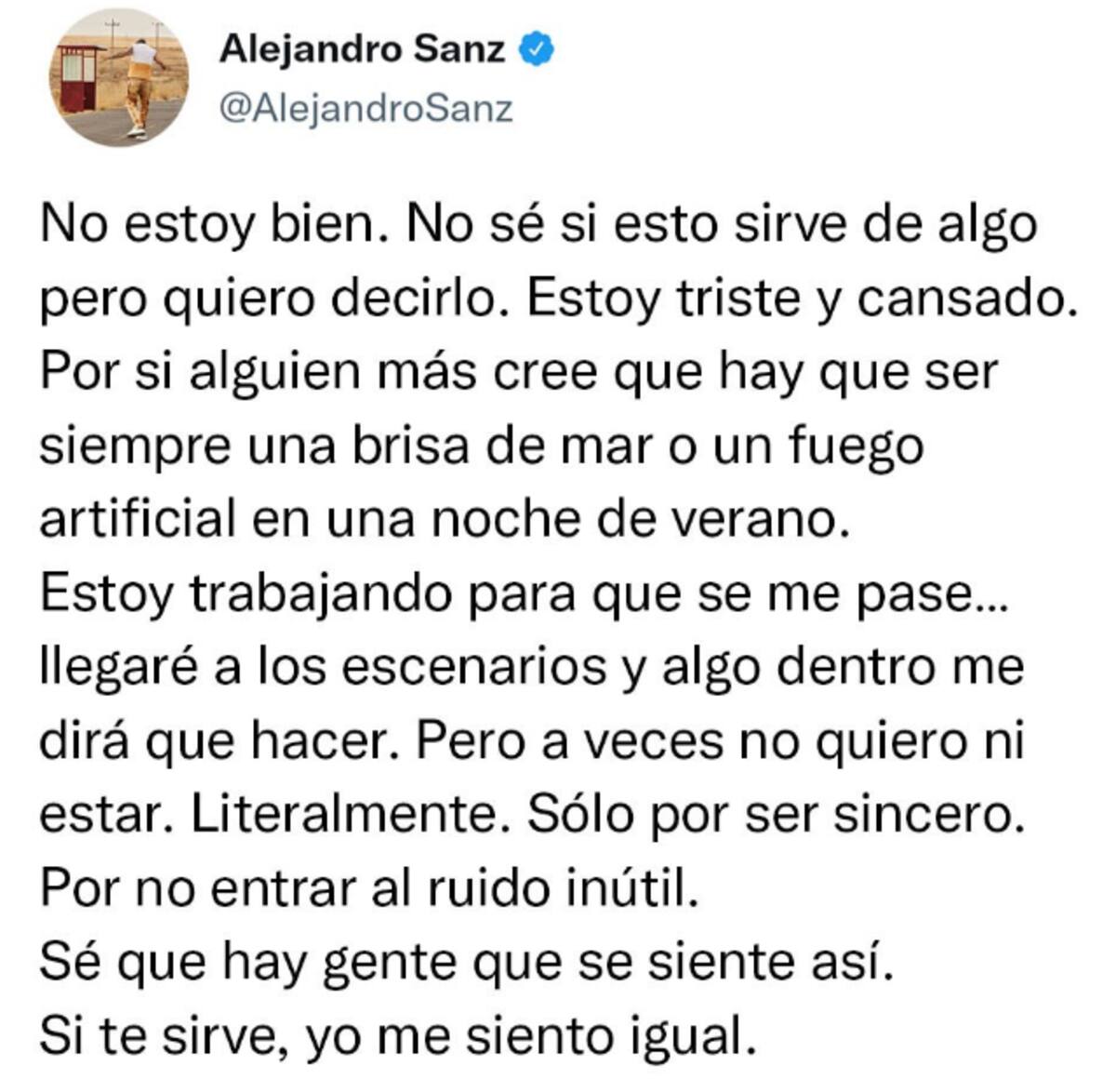 El pasado 16 de mayo, Sanz sorprendió a sus fanáticos al revelar en sus redes sociales que estaba atravesando por una depresión. Manifestó sentirse triste y cansado, pero expresó su determinación de superar esta situación. Sus seguidores le enviaron mensajes de apoyo y optimismo en medio de su lucha.