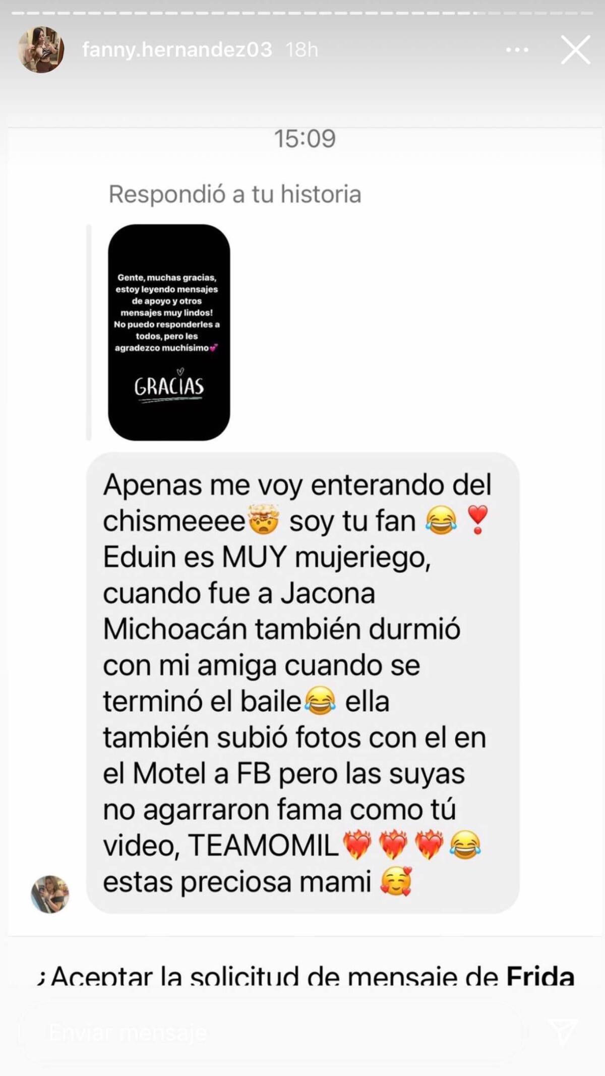 Apenas me voy enterando del chisme. Soy tu fan. Eduin es muy mujeriego, cuando fue a Jacona, Michoacán también durmió con mi amiga cuando se terminó el baile. Ella también subió fotos con él en el motel a Facebook, pero las suyas no agarraron fama como tu video. Te amo mil”, le escribió Frida a Fanny por mensaje privado.