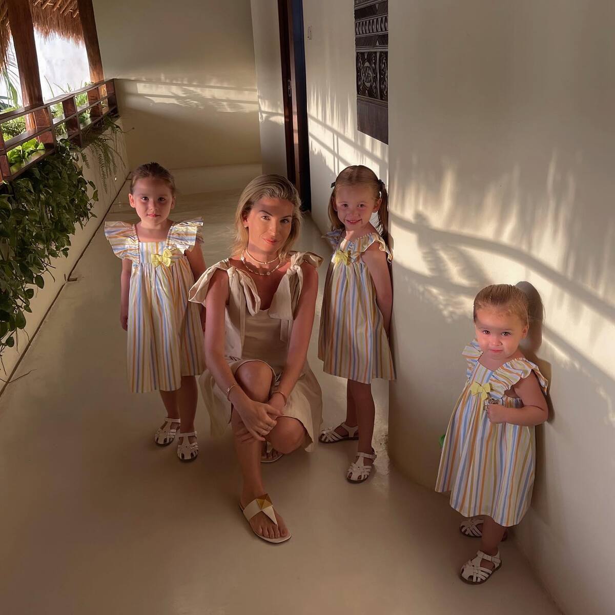 Para hacer este video, la influencer vistió a sus hijas con trajes de baño en color morado y lentes de sol, mientras que ella usó un bikini blanco, el cual combinó con un pareo de playa.