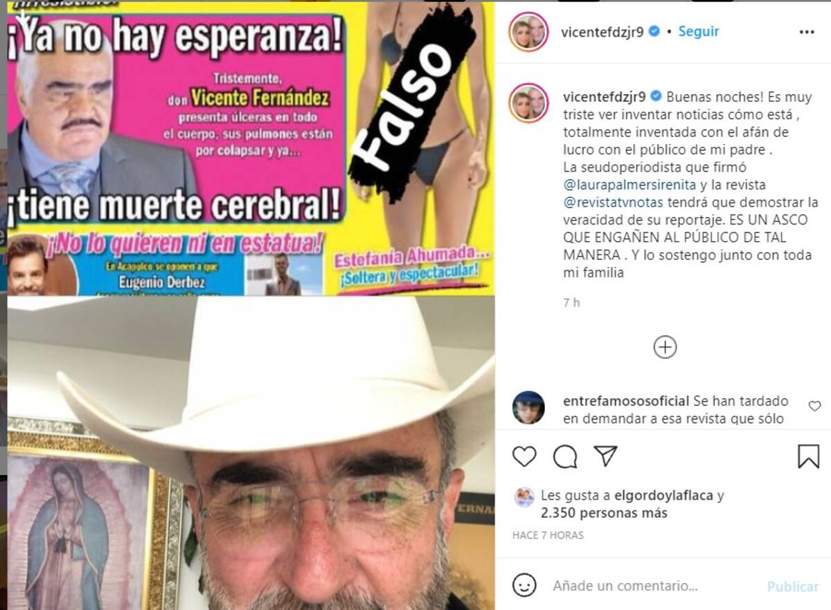 CIUDAD DE MÉXICO.- Después de que Tv Notas informara que Don Vicente Fernández tiene muerte cerebral, Vicente Fernández Jr acudió a sus redes sociales para desmentir tal publicación.