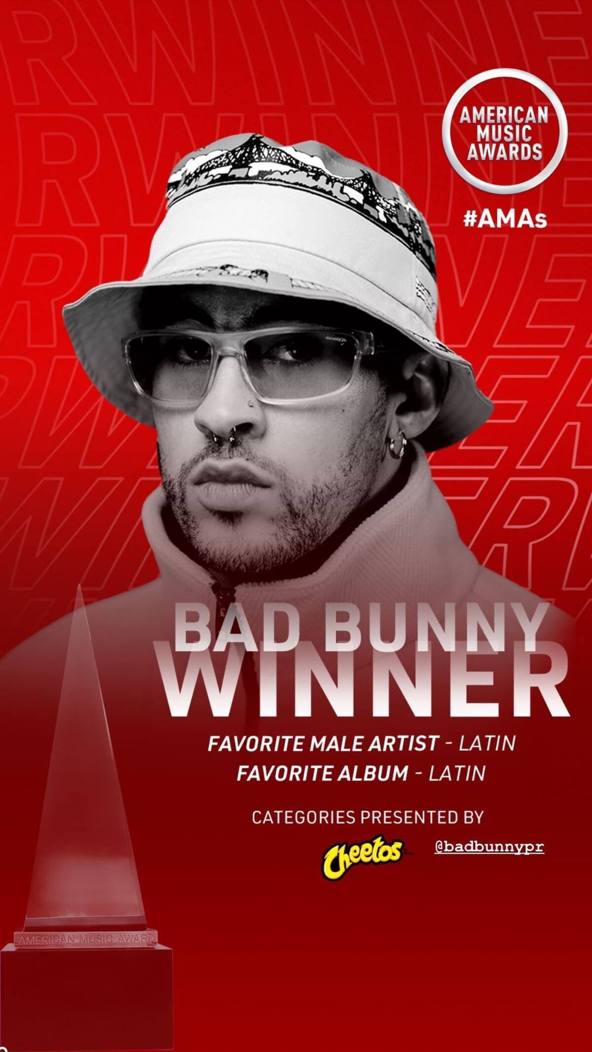 Bad Bunny ganó el galardón en la categoría de “Artista Masculino Favorito-Latino” y el de “Álbum Favorito-Latino”, con YHLQMDLG.