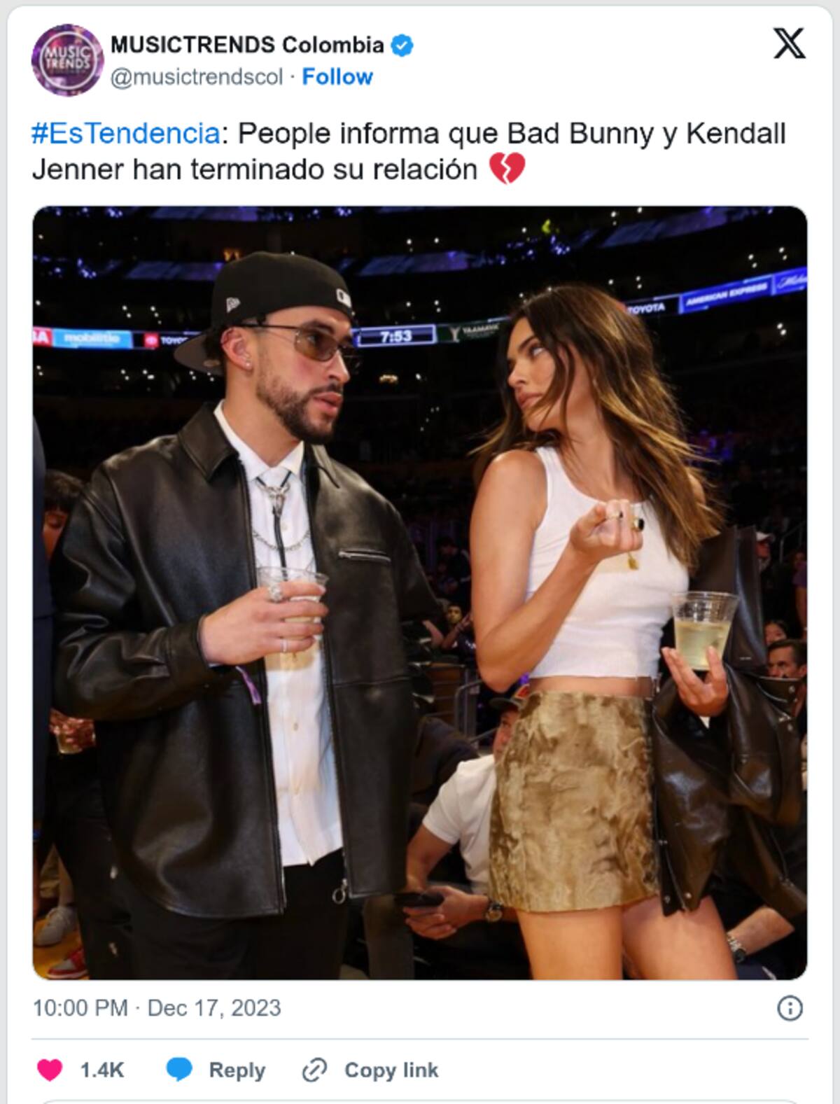 La última vez que ambos fueron vistos juntos fue el pasado mes de octubre durante la fiesta posterior al Saturday Night Live, donde Bad Bunny desempeñó el papel de coanfitrión e invitado musical. Desde entonces, la pareja no ha sido captada compartiendo momentos públicos.