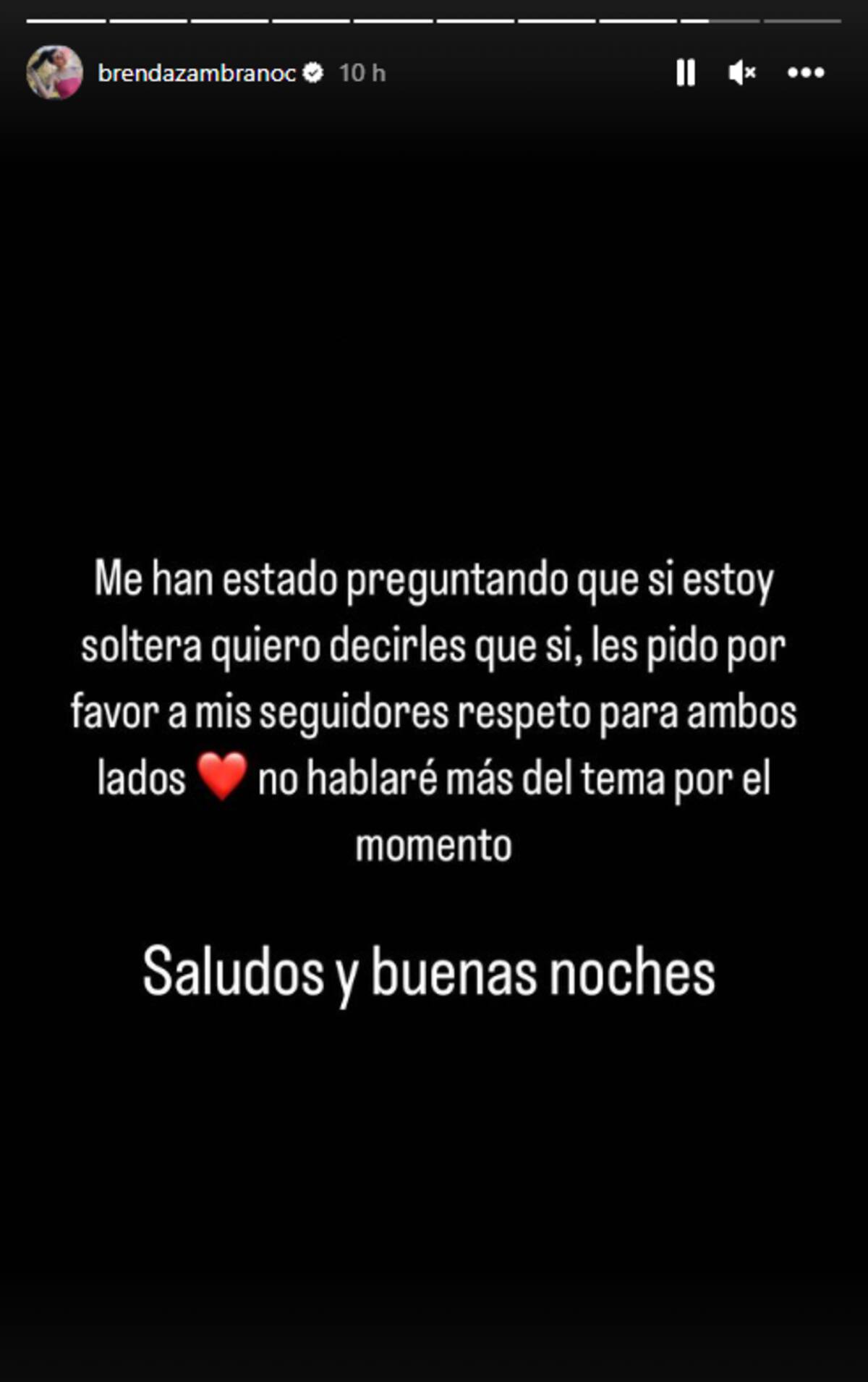 Me han estado preguntando que, si estoy soltera, quiero decirles que sí. Les pido a mis seguidores respeto para ambos lados. No hablaré más del tema por el momento. Saludos y buenas noches”, escribió la ex participante de “La Casa de los famosos 2”.