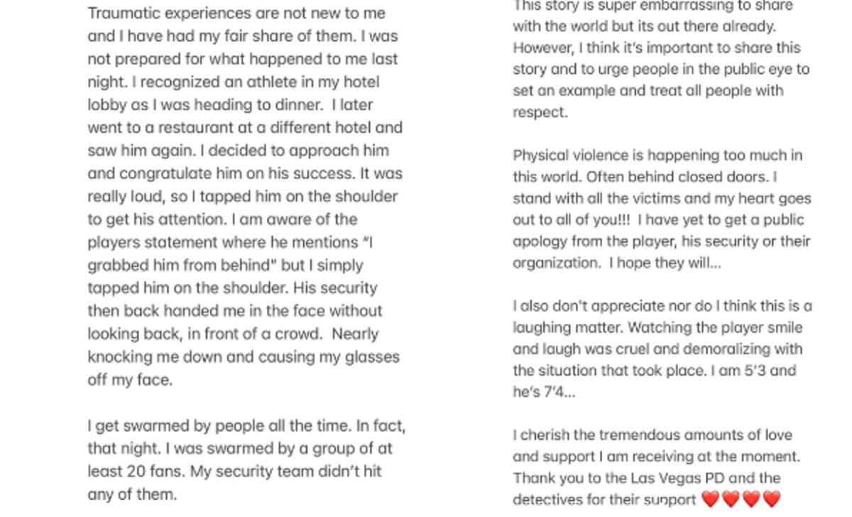 Desafortunadamente, lo que sucedió a continuación fue extremadamente terrible: "Su equipo de seguridad me abofeteó en la cara sin miramientos, frente a una multitud. Casi me tiran al suelo y mis gafas salieron volando". En la misma publicación, Britney dejó claro a Wembanyama la incompetencia con la que su equipo manejó la situación.