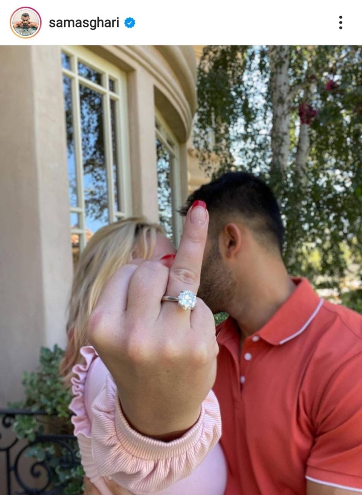 Por su parte, Asghari compartió una imagen también a través de su cuenta de Instagram, donde podemos ver cómo besa a la bailarina, quien estira su brazo para mostrarnos su dedo anular con el anillo de diamantes.
