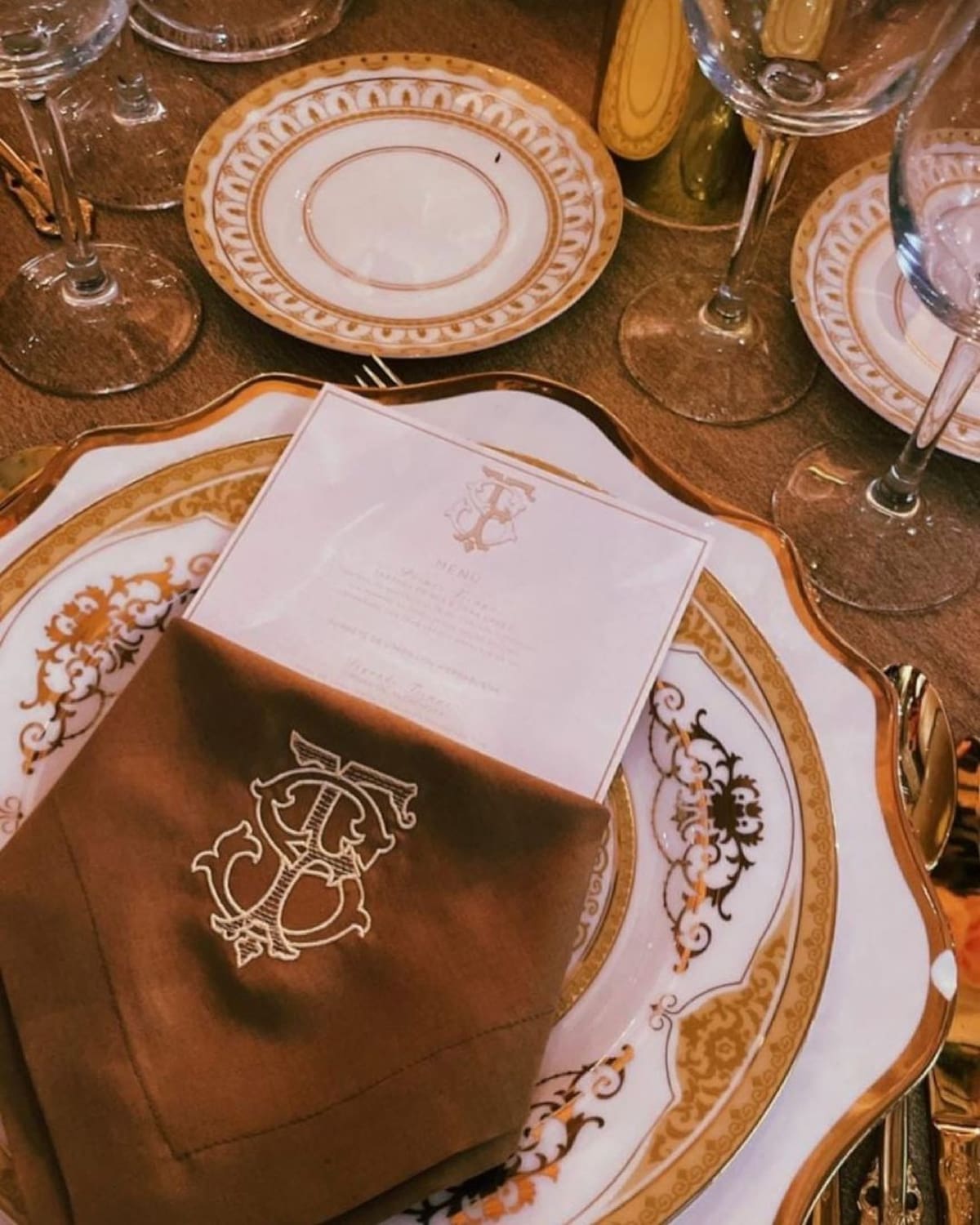 Las mesas fueron adornadas con mantelería blanca, bajo plato dorado con blanco y copas, así como con el menú, el cual contaba con una servilleta en color café con las iniciales bordadas de la pareja. Además, fueron acompañadas con un hermoso centro de mesa con rosas y velas.
