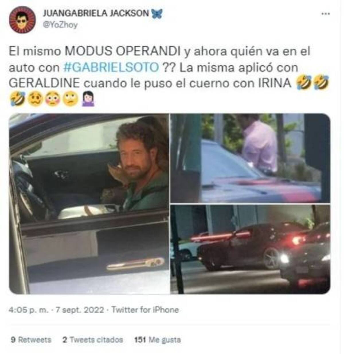 Fue en la cuenta de Twitter de "Juangabriela Jackson" que se puede leer: "El mismo modus operandi, ¿y ahora quién va en el auto con Gabriel Soto? La misma aplicó con Geraldine cuando le puso el cuerno con Irina", se puede leer.