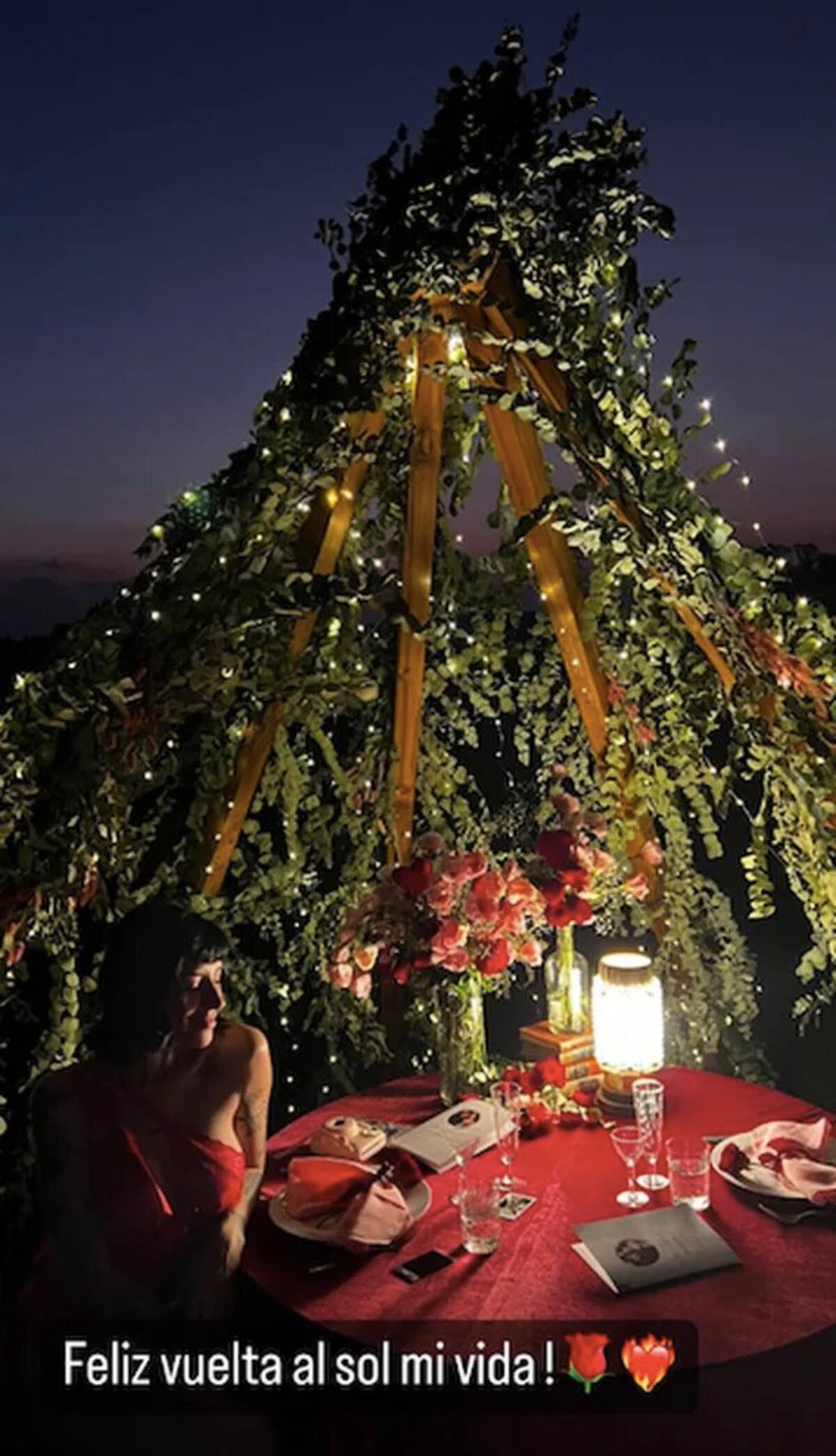 Por su parte, Nodal también publicó una fotografía de la cena que tuvieron junto a una impresionante estructura floral. El cantante de ‘De los besos que te di’ le dedicó unas tiernas palabras a su amada.