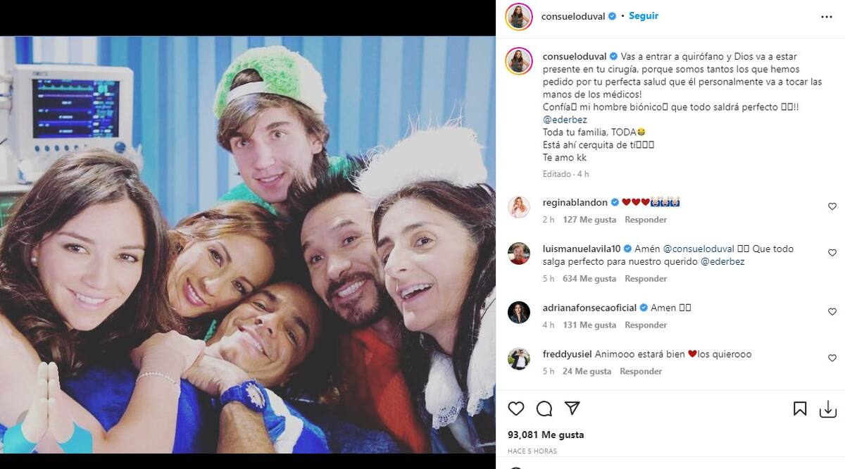 Vas a entrar a quirófano y Dios va a estar presente en tu cirugía porque somos tantos los que hemos pedido por tu perfecta salud que él personalmente va a tocar las manos de los médicos”, escribió Consuelo Duval junto a una fotografía donde se ve junto a su familia de “La Familia P Luche”.