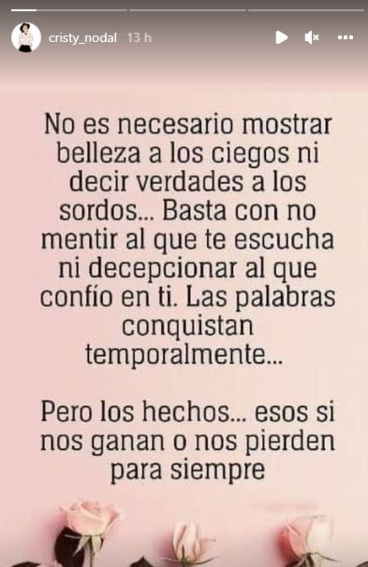 Mediante sus historias de Instagram, doña Cristy publicó que no es necesario mostrar la belleza a los ciegos ni decir la verdad a los sordos, pues lo único que se necesita es no mentir ni decepcionar a quien te escucha y te da la confianza.