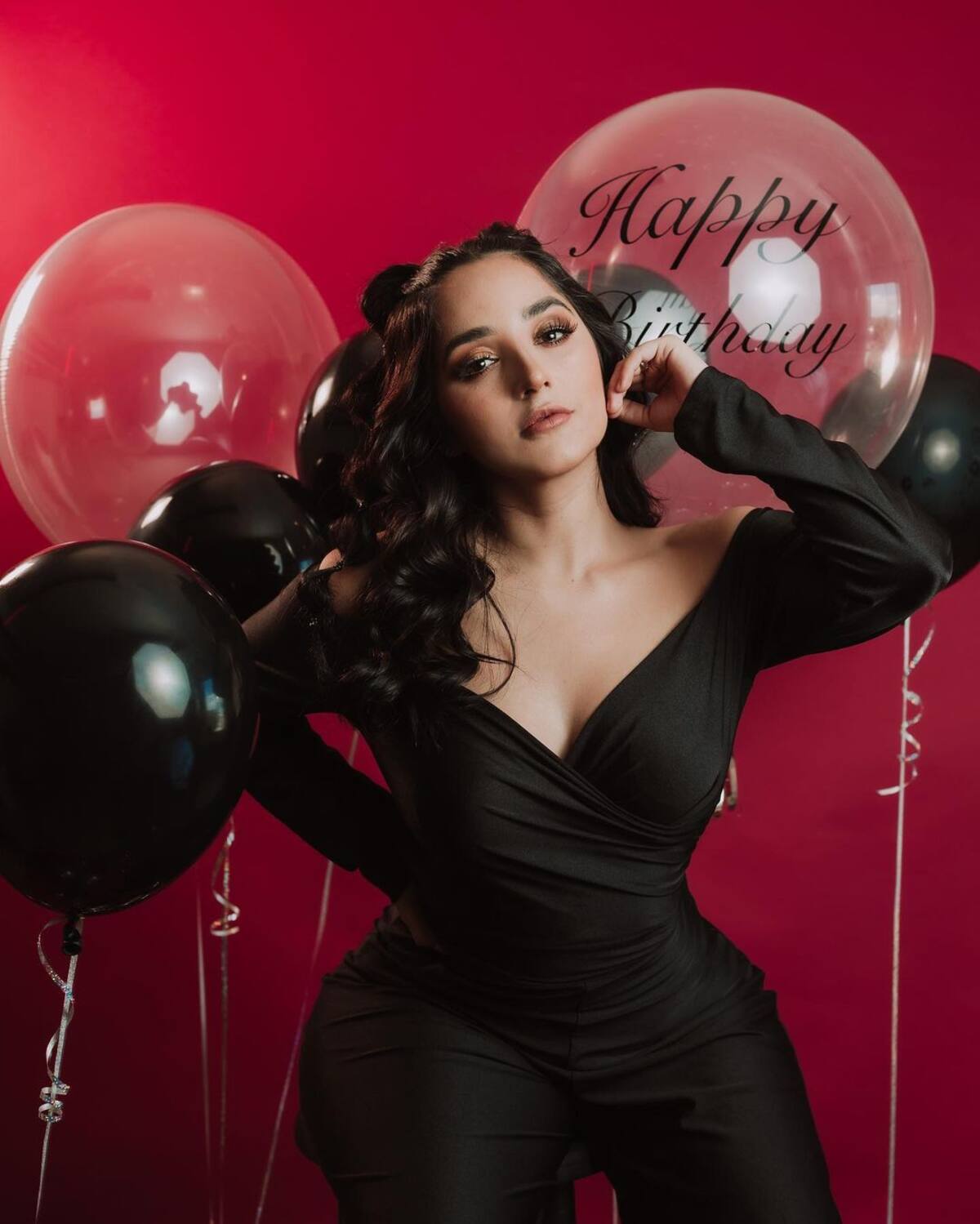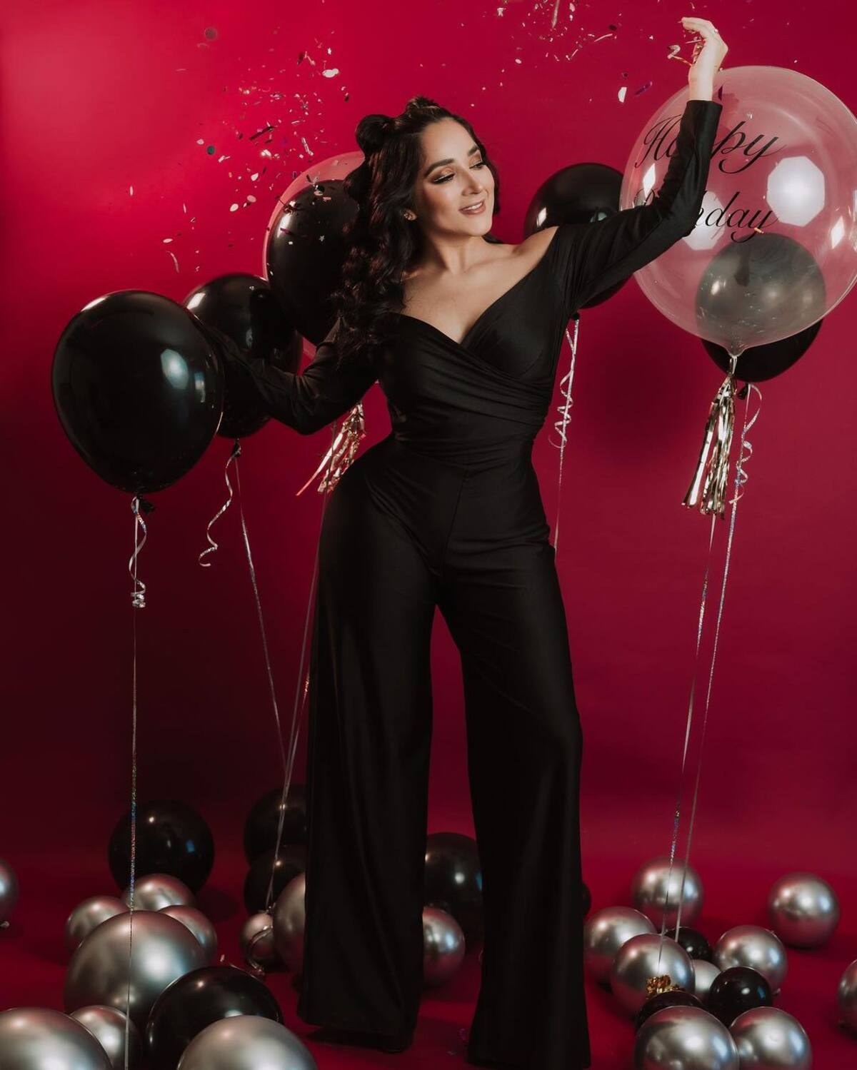 En las instantáneas se ve a la esposa de Eduin Caz, vocalista de Grupo Firme, vistiendo un jumpsuit negro de piernas anchas, mientras cargaba un hermoso pastel rodeada de globos que decían “Happy Birthday”.