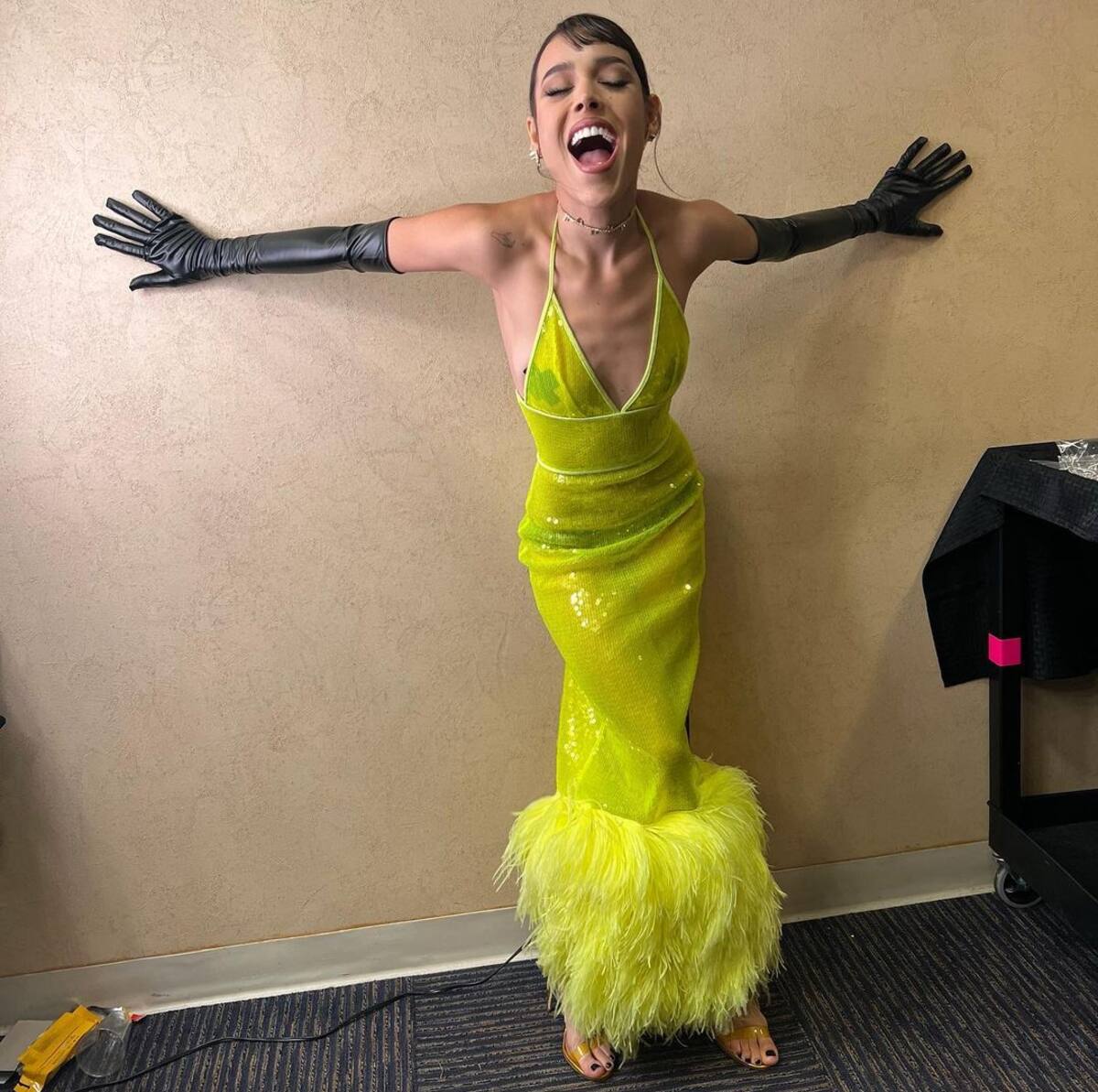 La intérprete de “Mala Fama” fue presentadora en los premios de Univision donde vistió un vestido amarillo completamente transparente, el cual combinó con guantes largos y tacones.