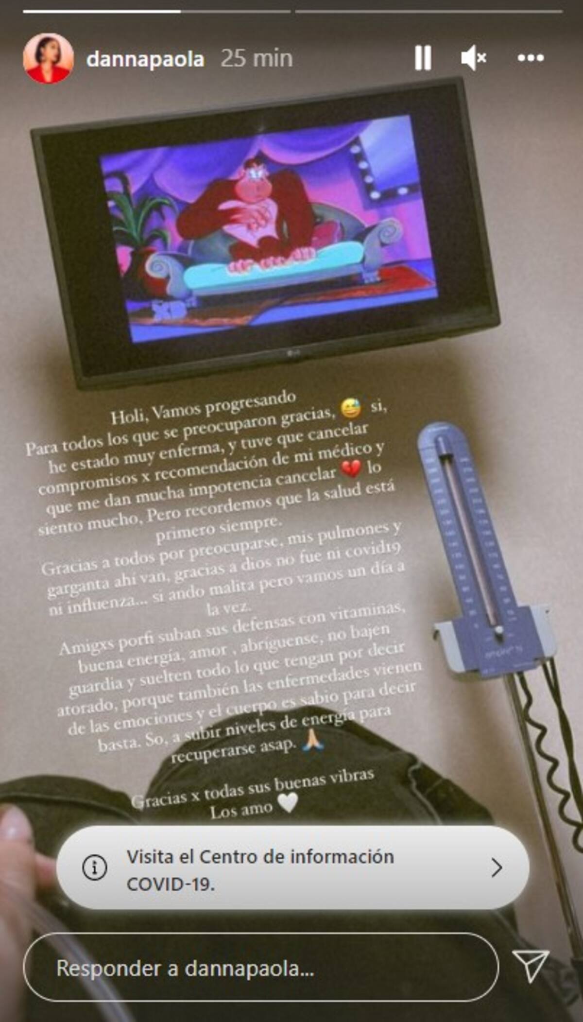 Holi, vamos progresando. Para todos los que se preocuparon gracias, sí, he estado muy enferma, y tuve que cancelar compromisos por recomendación de mi médico y que me da mucha impotencia cancelar, lo siento mucho, pero recordemos que la salud está primero siempre”, comenzó su mensaje Danna Paola.