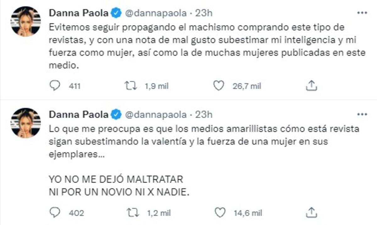 Lo que me preocupa es que los medios amarillistas cómo está revista sigan subestimando la valentía y la fuerza de una mujer en sus ejemplares… YO NO ME DEJÓ MALTRATAR NI POR UN NOVIO NI X NADIE”, escribió en un tuit Danna Paola.