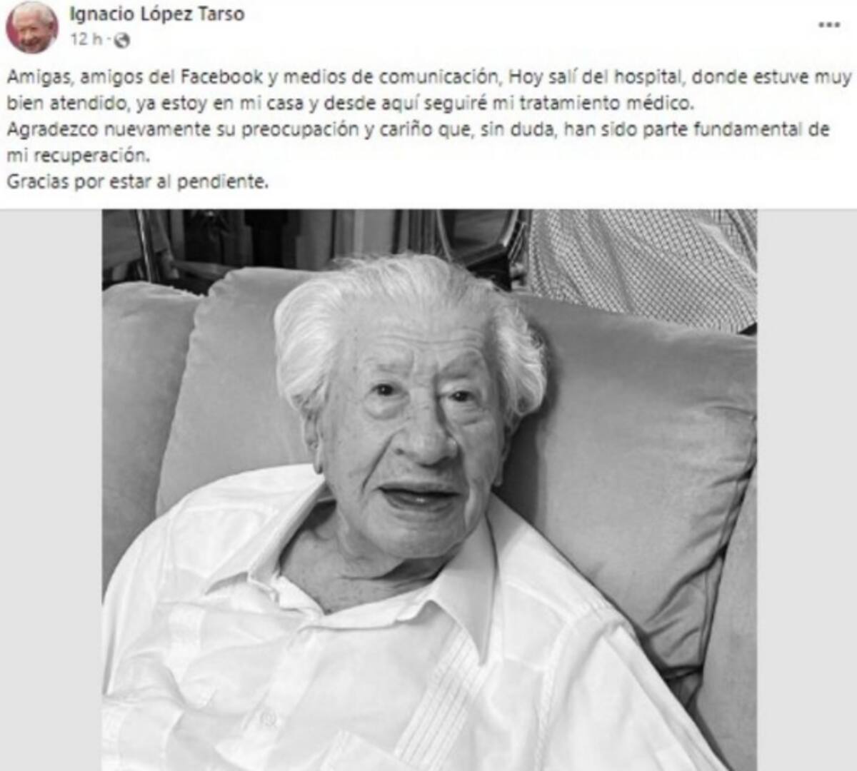 Amigas, amigos del Facebook y medios de comunicación. Hoy salí del hospital, donde estuve muy bien atendido, ya estoy en mi casa y desde aquí seguiré mi tratamiento médico. Agradezco nuevamente su preocupación y cariño que, sin duda, han sido parte fundamental de mi recuperación. Gracias por estar al pendiente", escribió.