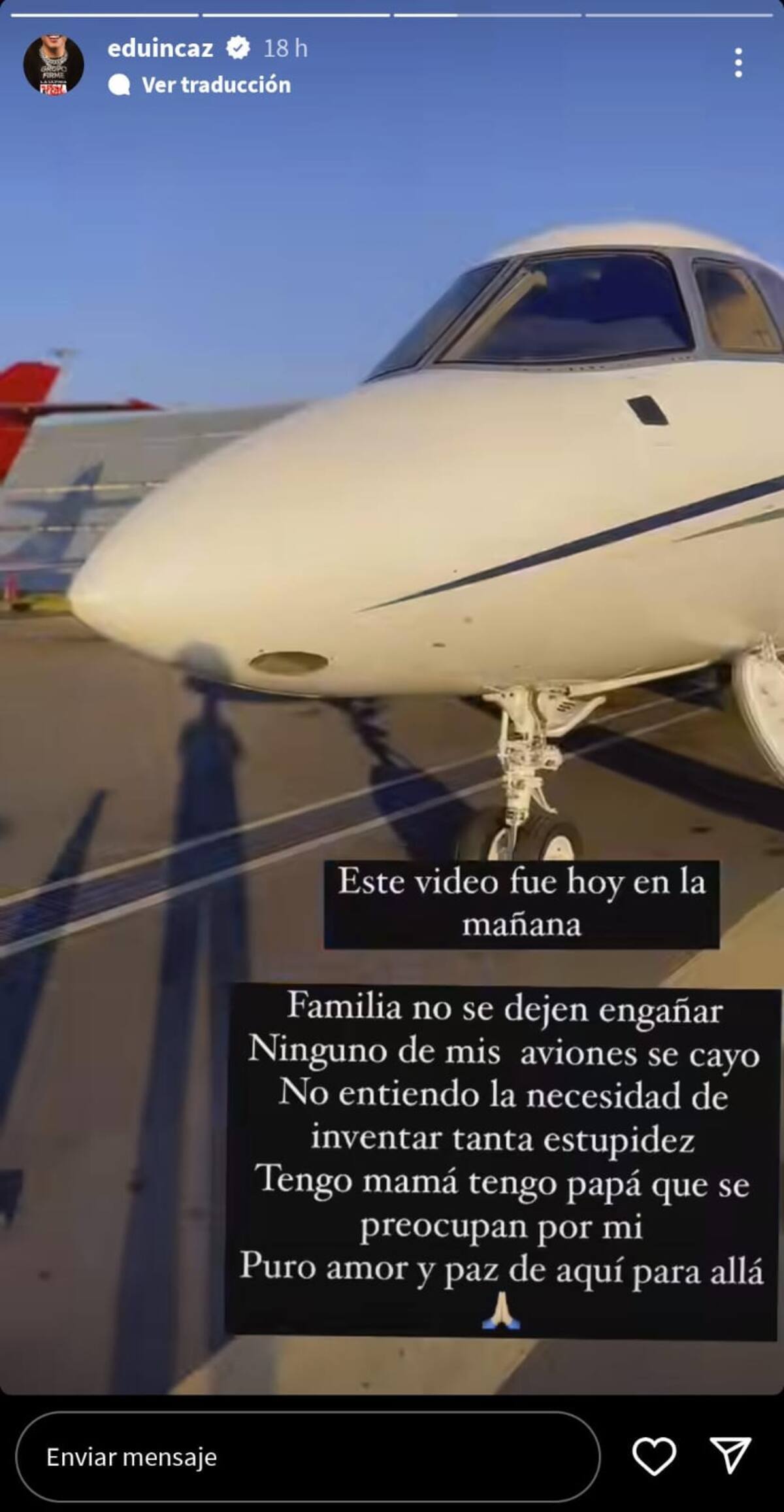 "Este video fue de hoy en la mañana. Familia, no se dejen engañar. Ninguno de mis aviones se cayó. No entiendo la necesidad de inventar tanta estupidez. Tengo mamá, tengo papá, que se preocupan por mí. Puro amor y paz de aquí para allá", escribió Eduin Caz en su publicación.