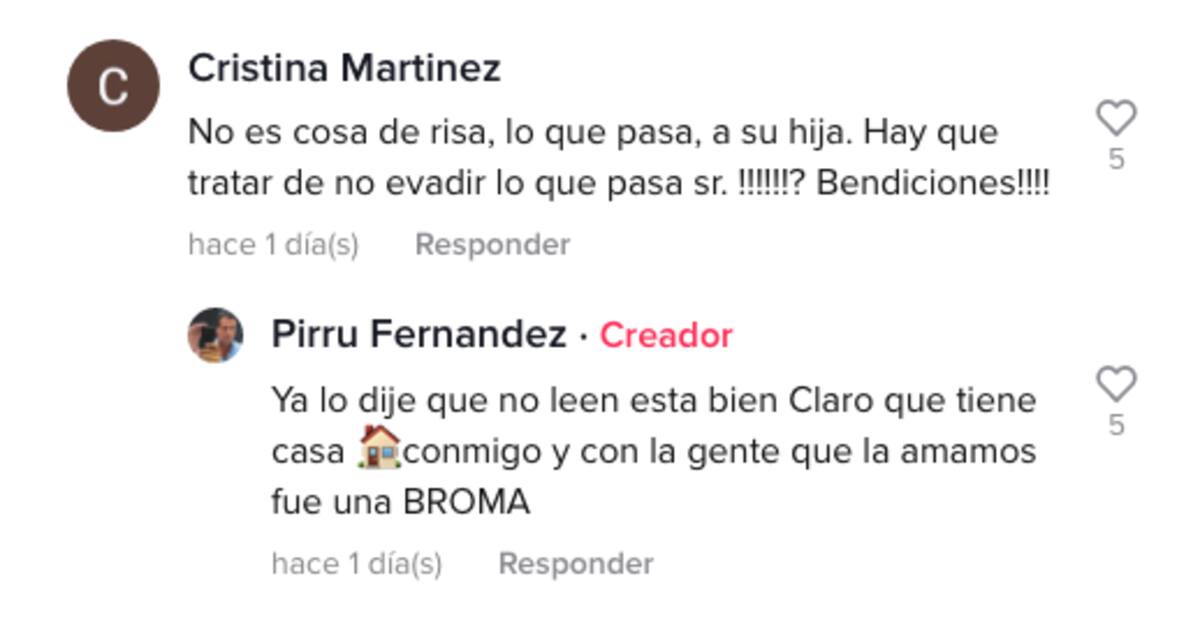 En un comentario se puede leer que Fernández menciona que Paula sí tiene casa y tiene a muchas personas que la quieren, pero que en el video ella estaba bromeando.