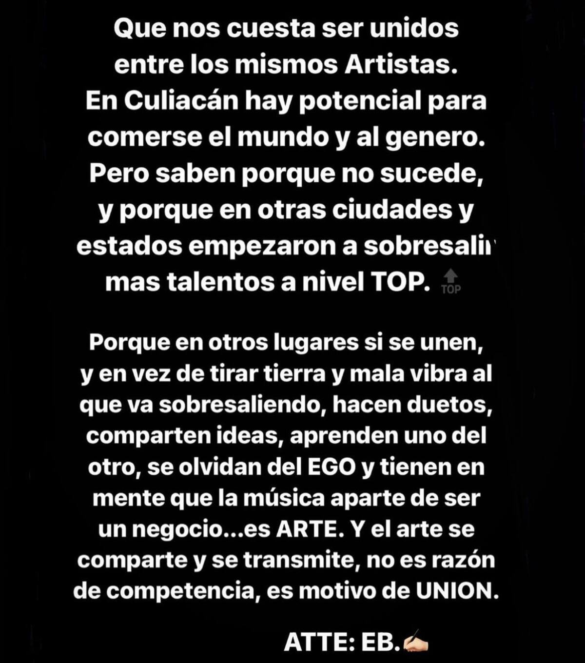 Que nos cuesta ser unidos entre los artistas. En Culiacán hay potencial para comerse al mundo y al género. Pero saben por qué no sucede y porque en otras ciudades y estados empezaron a sobresalir más talentos a nivel top”, comenzó su mensaje el artista.